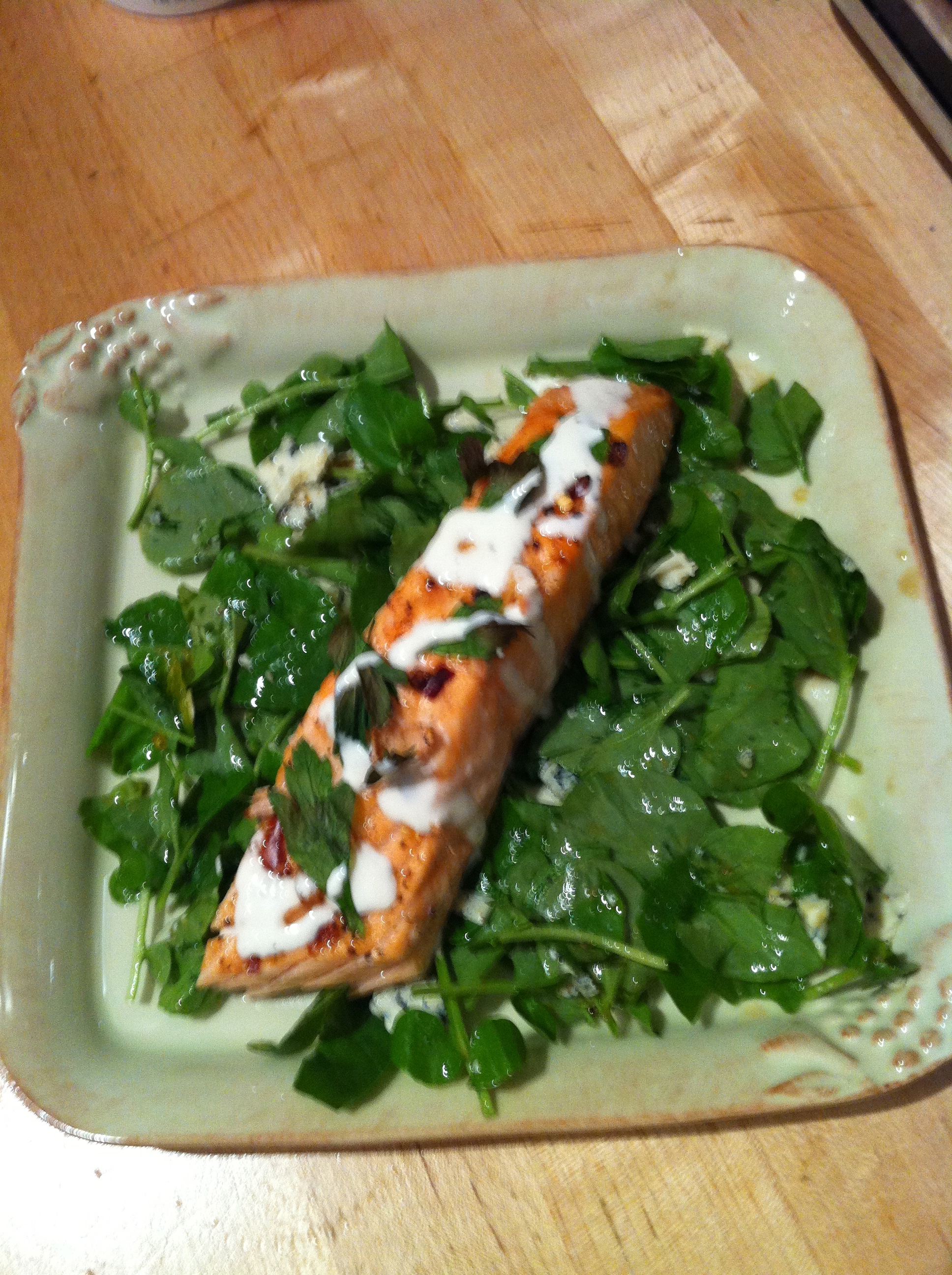 Then chill the dressing till the fish is about done. Take some watercress (or spinach or arugula if you don’t have watercress) and mix it with a bit of dressing to taste. Add some lovely blue cheese of your choosing.