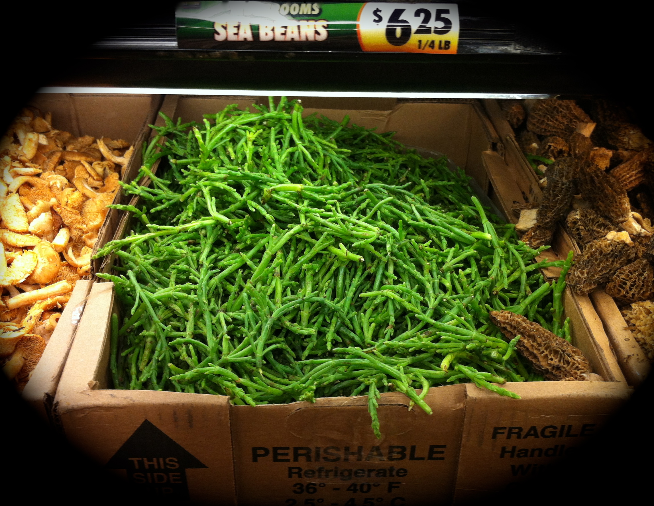 Winter means asparagus from Peru and frozen vegetables from who knows where. Once spring hits, we’re all eager for the bounties from our summer garden or local farmer’s markets. With the thawing ground, we’re forced to declare our love for ramps, an amped-up scallion. Eventually — if the weather cooperates — after a shelling out process, in dollars and pods, you might yield enough peas for one side-portion of risotto. Bored by the limited, fresh options available in early spring, I went in search of versatile, green way to transition my dishes from spring to summer. Nestled between the golden, pricey chanterelles and the lollipop-shaped but difficult to cook fiddlehead ferns, was a strange, branchlike vegetable: the sea bean.