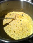 Slice the corn from the cobs and reserve 2 cobs. In a large saucepan, saute the pancetta or bacon over medium low for about 5 minutes. (There should be enough fat that you don’t need to add any butter or oil.) Add the onion, jalapeno and scallions to the pan and reduce the heat to low. (There should still be enough pork fat to cook. If not, add a bit of butter.) Sprinkle with salt and pepper. Saute for about 5 minutes or till tender. Then add the broth (I used veggie because the chicken can be a bit stronger) and the 1/2 and 1/2. Throw in the cobs and bring to a simmer. Let merge for about 5 minutes but don’t let it burn. Remove the cobs, then add the corn. Let it cook for another 5 minutes. Since the corn is fresh, it should not take long to cook, but you want to at least mix the flavors.