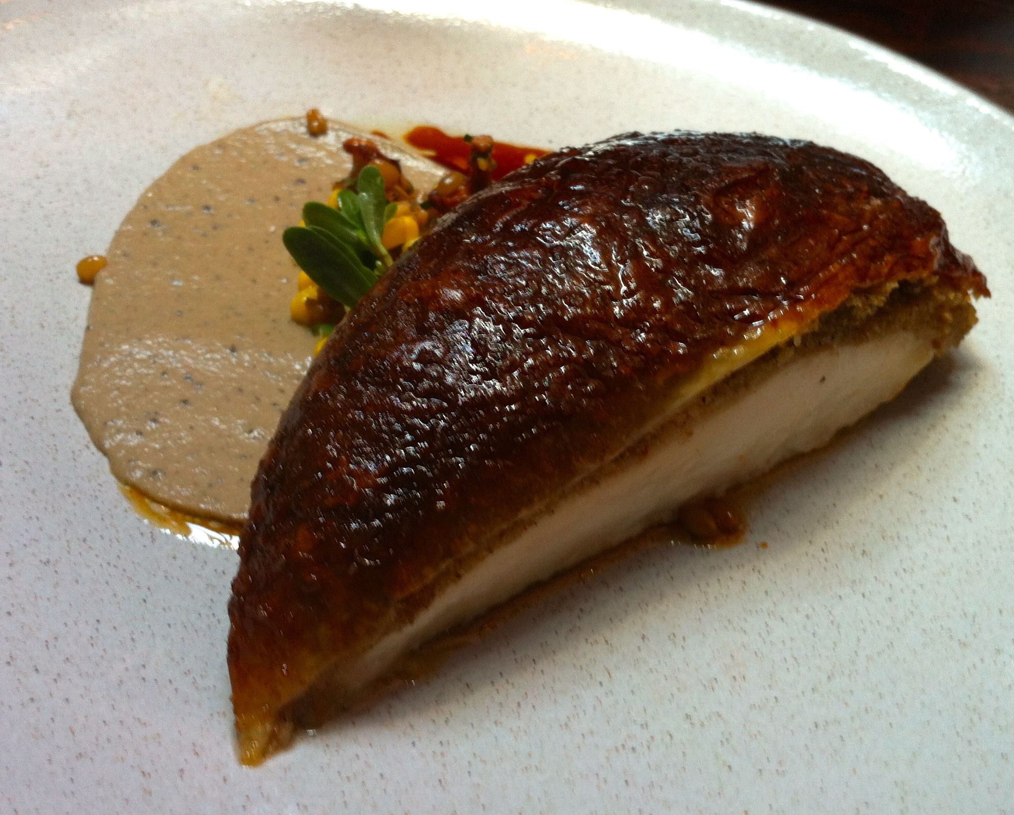 The layer of breading under the crisp skin was lacking in flavor, and the foie gras sauce was underwhelming and could have come from one of those pots of pate you’ll find at the market. The truffle flavor was almost absent. The side dish of the rich, dark meat with mushrooms and corn was more palate pleasing.