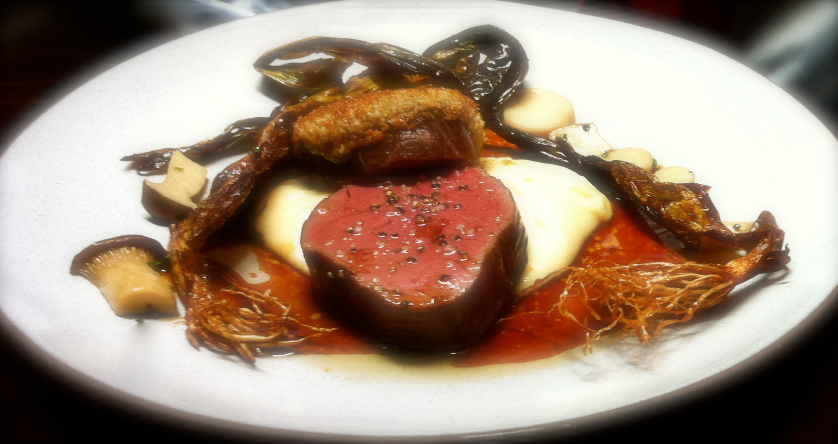 The filet of beef was tastier, but the bone marrow crust was greasy and thick, taking away from the flavor of the meat itself. The preparation of the crisp, frizzled leeks, however, was as tasty as it was entertaining.
