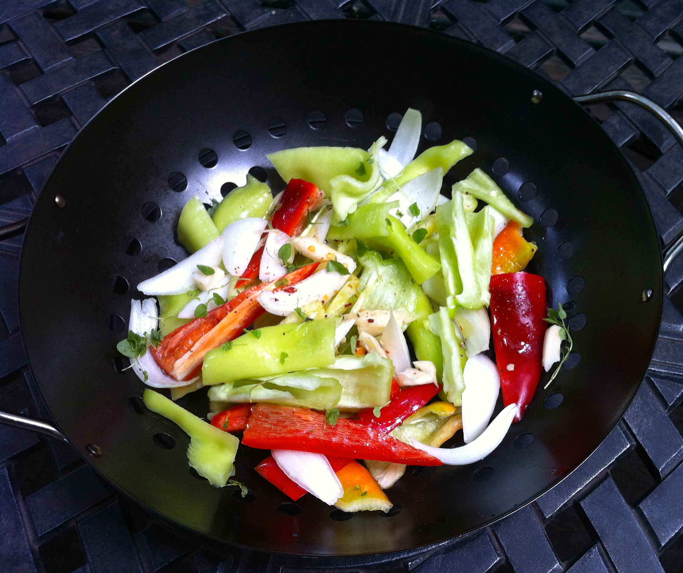 Preheat the grill to medium high. Slice or julienne the peppers and onions. Place peppers and onions in a grill basket and toss with olive oil, salt, pepper and oregano. (Because of the holes, I put a paper towel under the grill basket when prepping inside.)