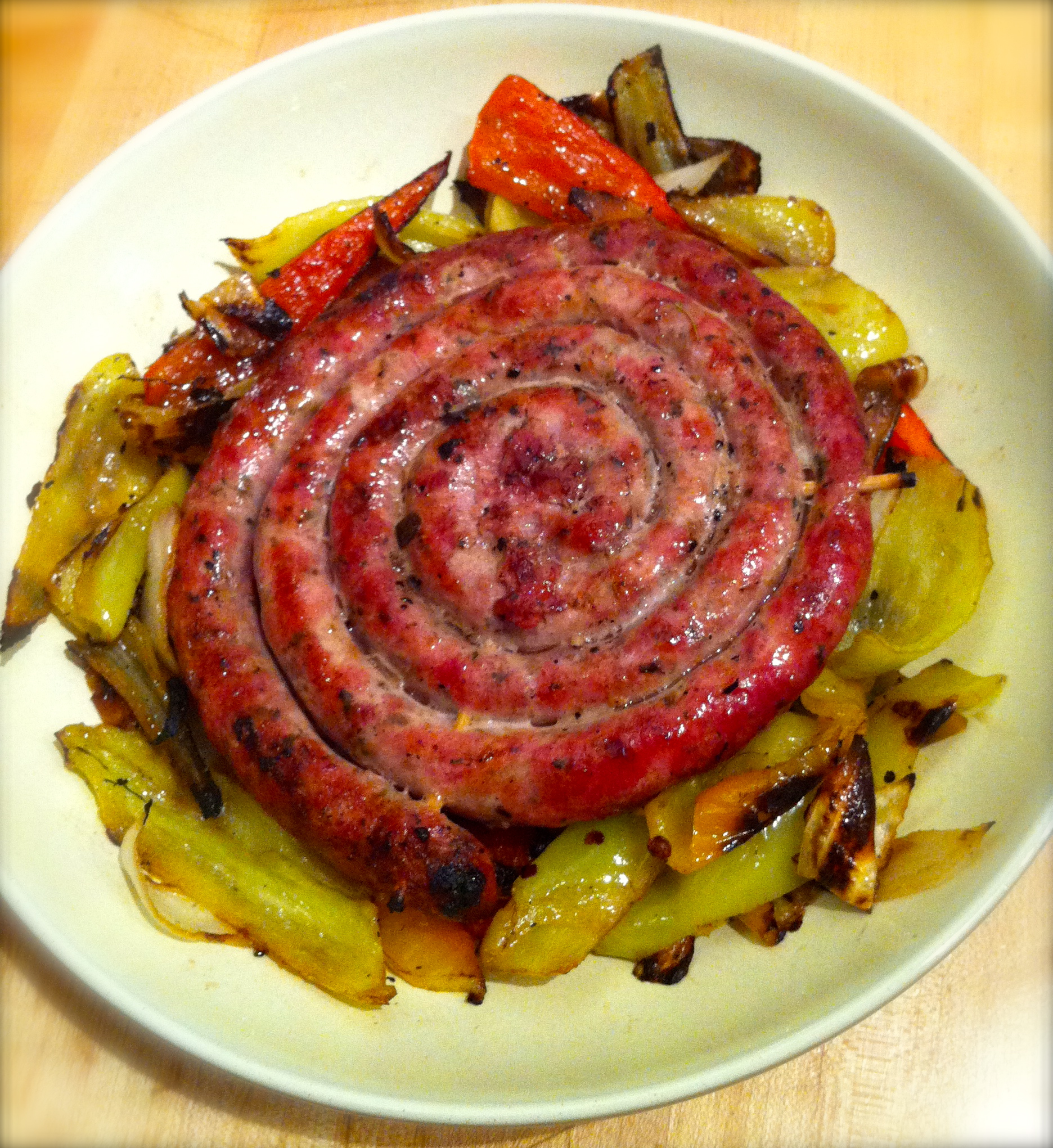 Serve on a plate or roll with spicy mustard. Or make a favorite of mine, the grinder, by adding a couple slices of provolone or mozz on top (maybe some spicy tomato sauce underneath). Grill the sandwich open-face quickly to melt the cheese and toast the bread. What a simple and delicious meal!