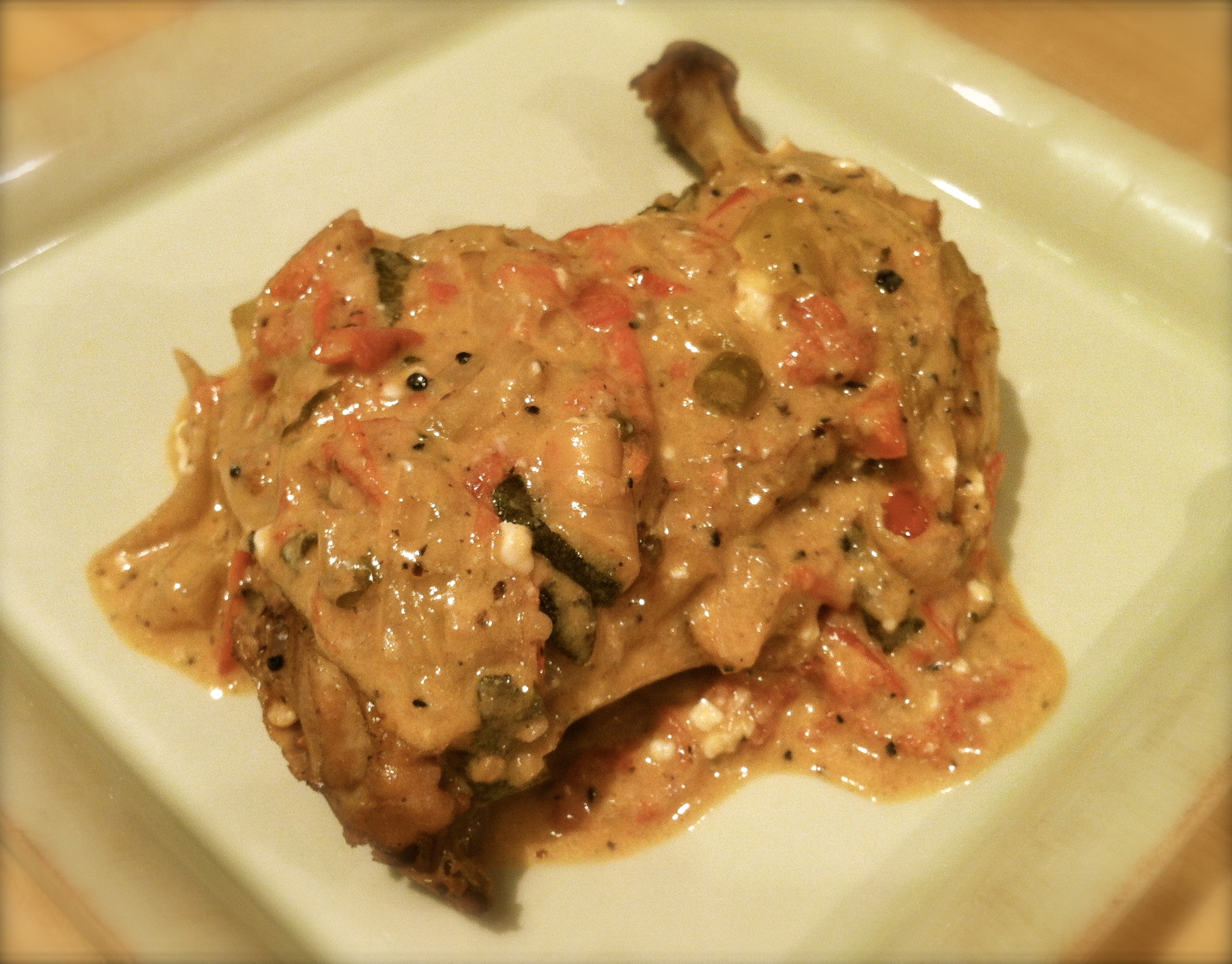 Going back to my Italian roots and spices from my trip to Istanbul, I came up with this spiced chicken dish topped with a sauce of peppers, onions and tomatoes. It thickens from cooking down the tomatoes. I used cherry tomatoes because I had an abundance of them as well. But you can dredge the chicken in flour before browning or you can add flour to make a roux if you want it thicker. I was keeping it simple and healthier. If you want it spicier, add some hot peppers to the mix, but it should be slightly fiery from the seasoning anyway.