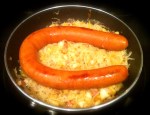 Looking for a simple, cheap and hearty meal to soak up the massive quantities of beer you may have been drinking lately in honor of Oktoberfest? Try some polish sausage and fermented cabbage. If you can find some fresh kielbasa, use that, but it will need to cook a lot longer. I prefer to make this in a cast iron pan and then finish cooking in the oven. But since I’m visiting some older relatives this weekend, I’ve been limited in my cooking materials and ingredients. Even with this simple recipe, there were no leftovers.