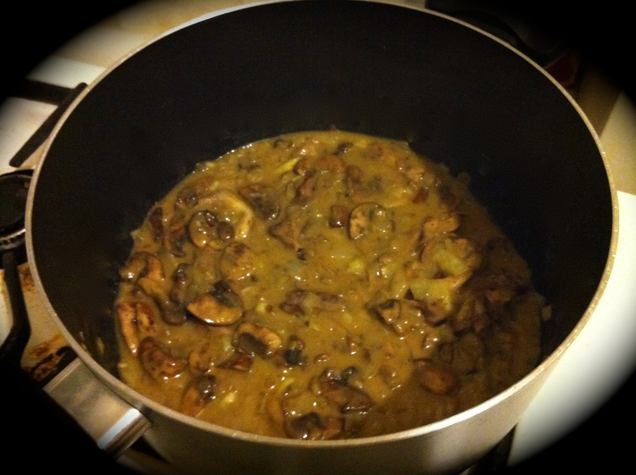 Stir in flour and curry until well blended. Gradually add broth. [N.B. Vegetable broth is lovely with this, but the chicken broth makes it much richer.] Bring to a boil and cook for about 5 minutes to release water and thicken some.