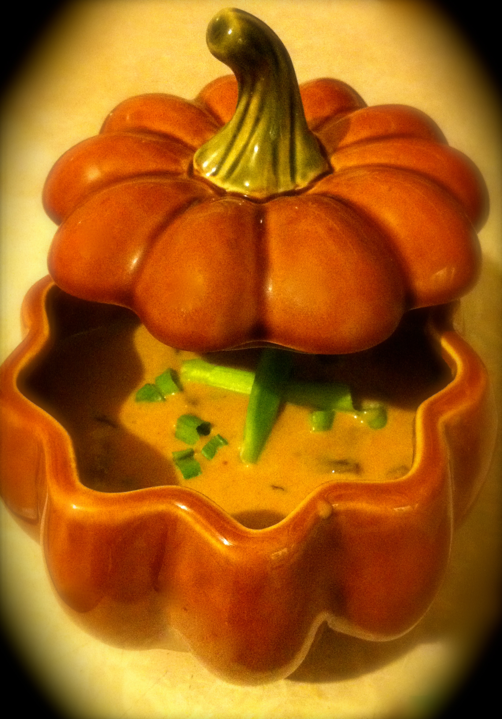 Top with some scallions if desired. Serve in festive pumpkin bowls if available (I got mine online from Target a few years ago).