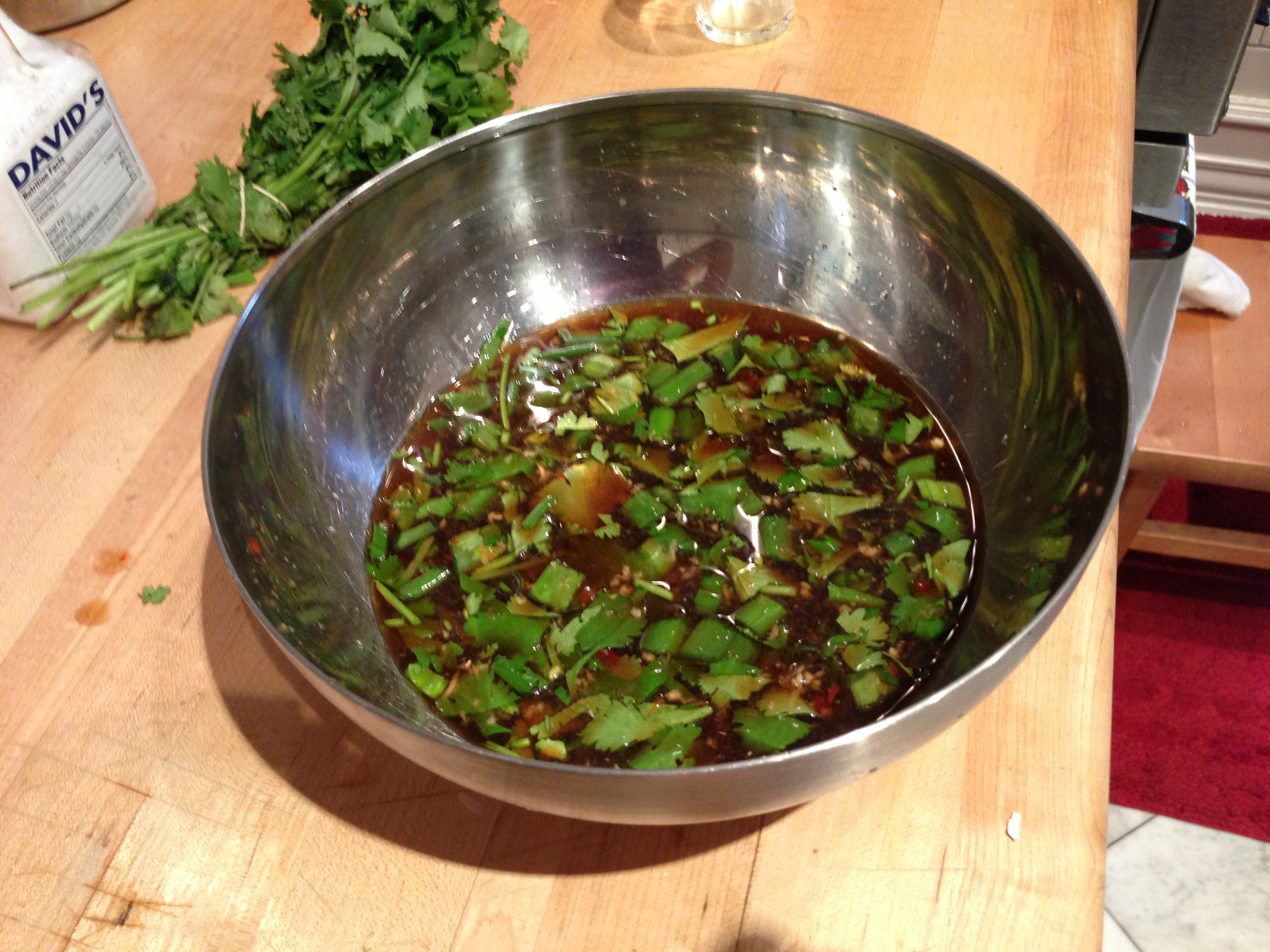 Mix together fish sauce, orange juice, soy sauce, ginger, sambal sauce, garlic, scallions, cilantro and water.