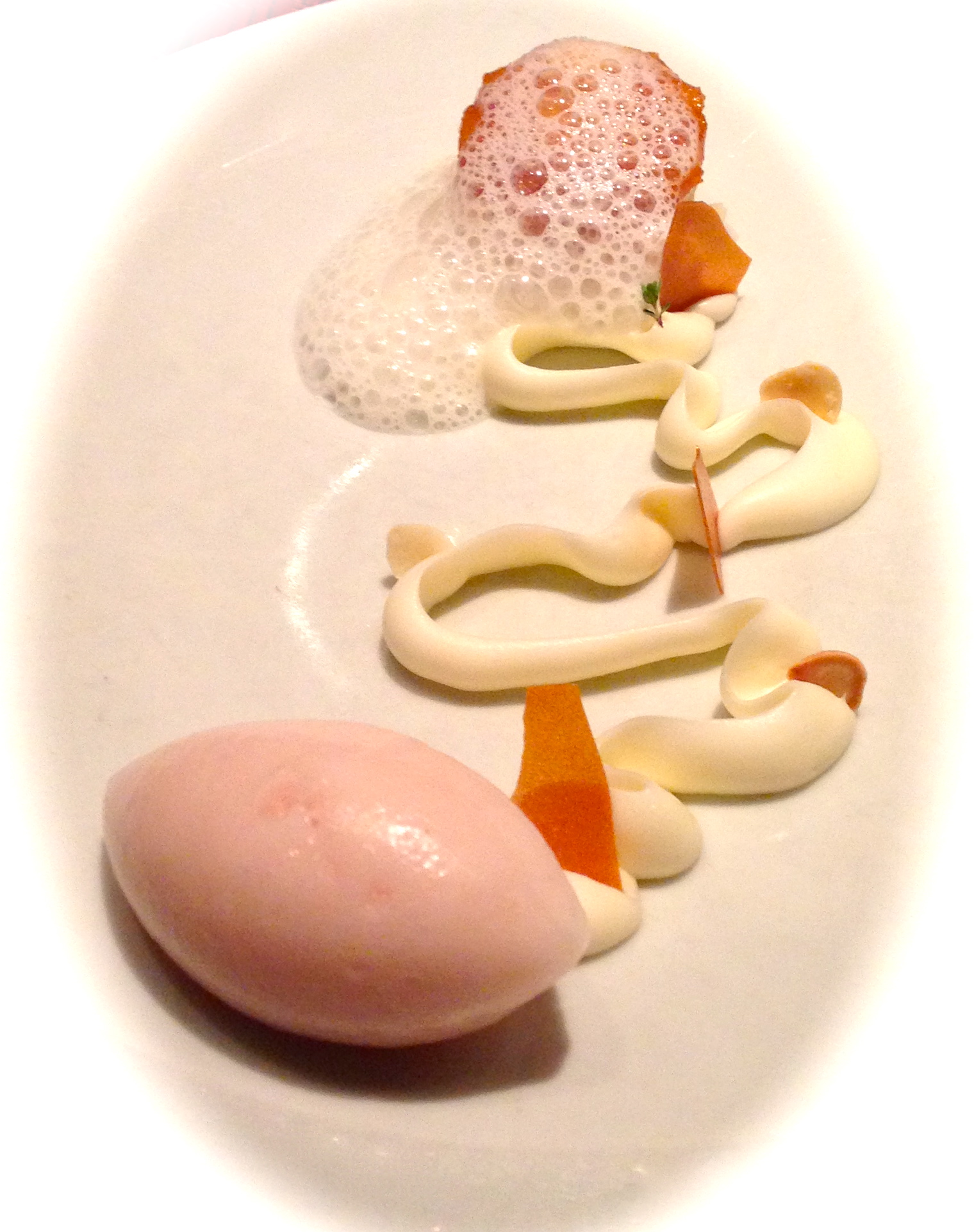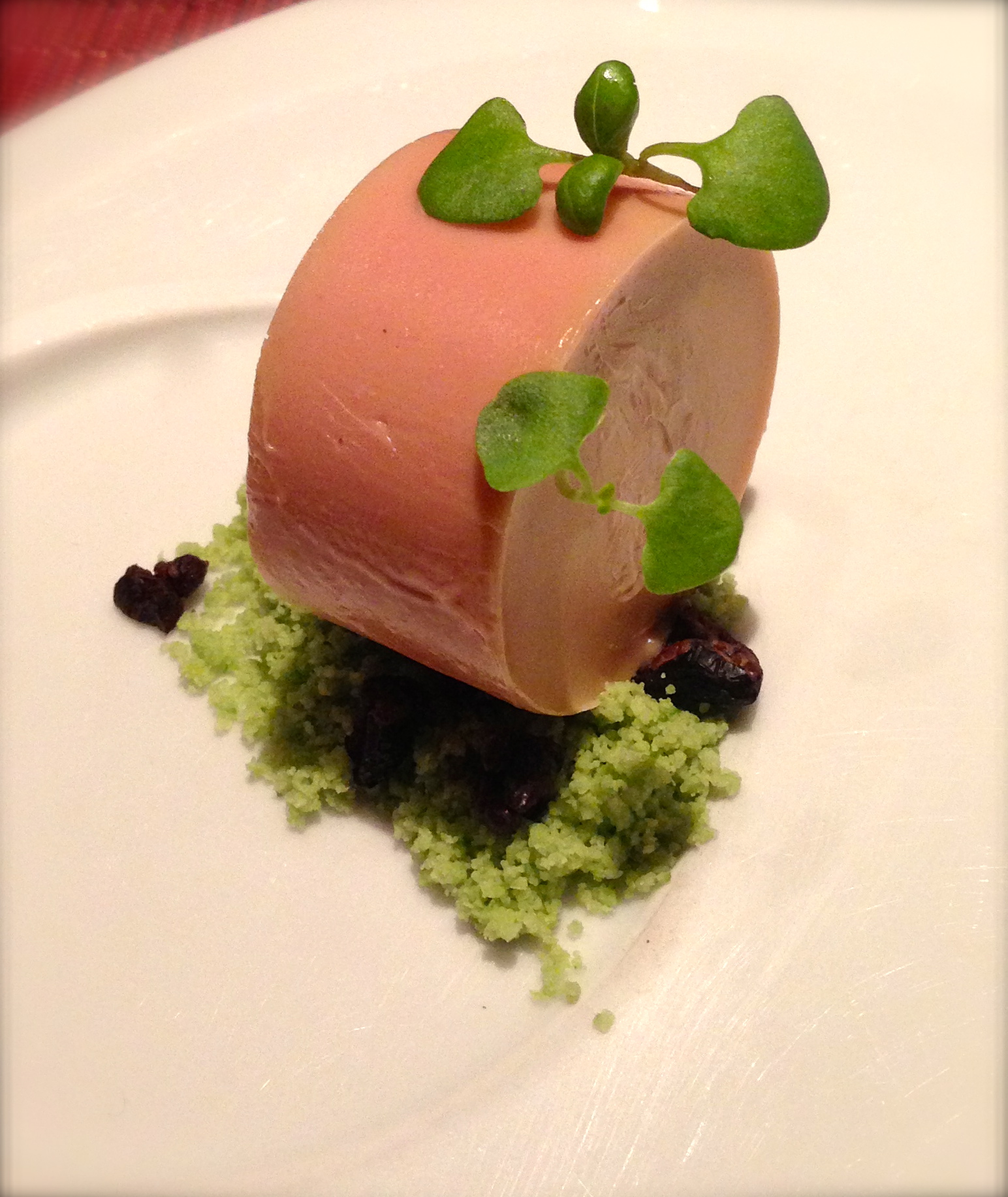 Next was the first real course — a foie gras disc surrounded by pea soil and candied olives. It was so beautiful I didn’t want to touch it, but of course I did.