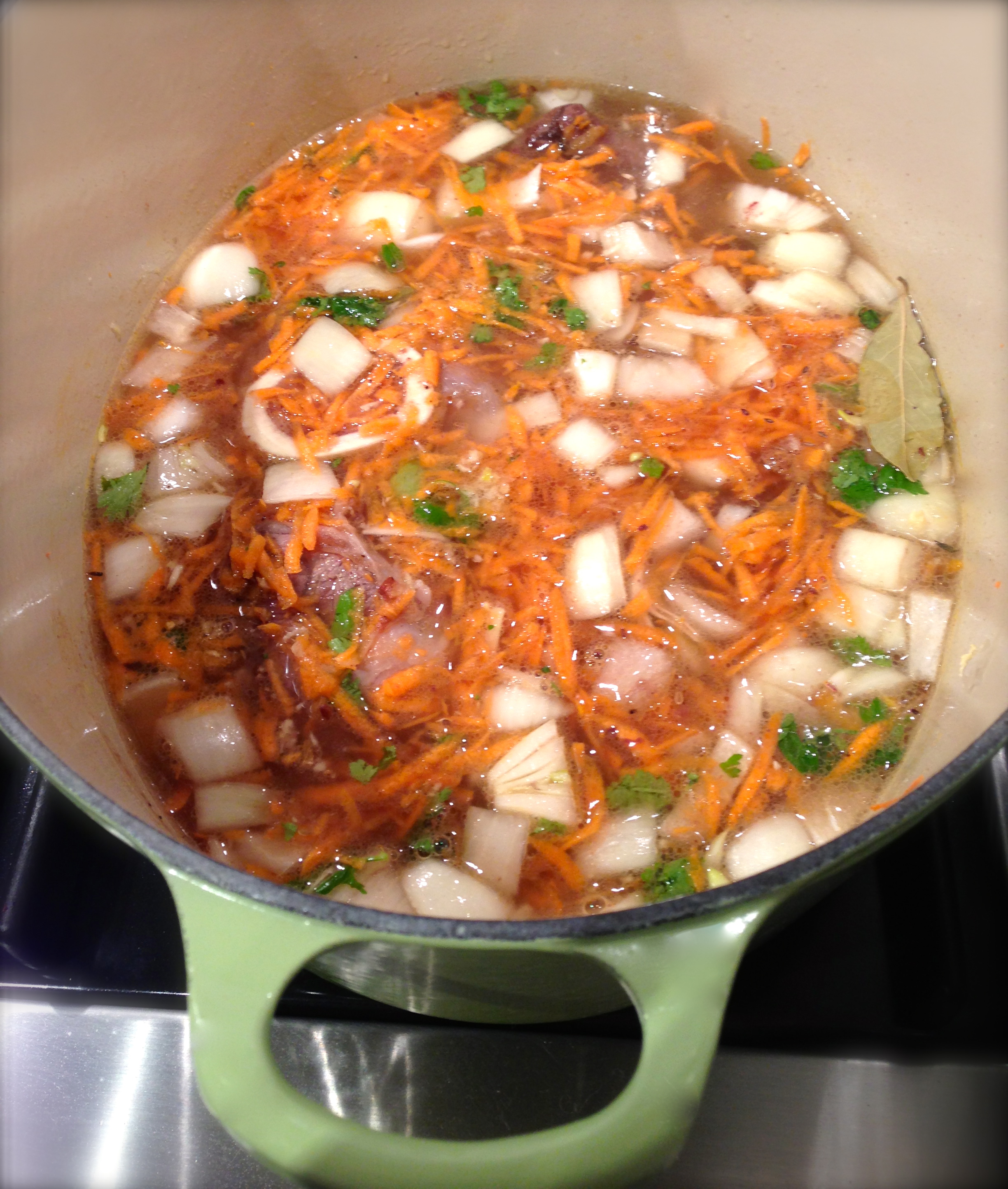Add onion, carrot, celery and garlic to pan. Saute for about 3 minutes. Then add enough stock to cover meat and veggies (I used homemade pork stock because I happened to have some, but beef would probably bring out even more flavor.) Sprinkle in salt, pepper, parsley, dill seed and a bay leaf.