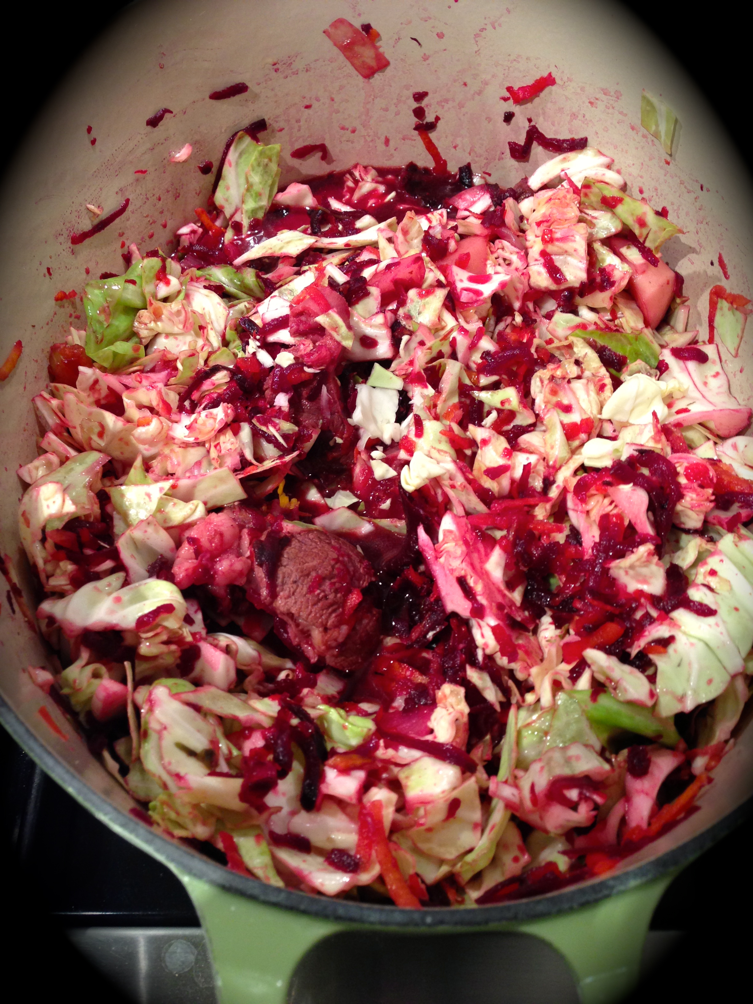 Let cook for about 2 hours on low, stirring occasionally. Then stir in grated beets, cabbage, potatoes and red wine vinegar. Sprinkle with some more salt and pepper.