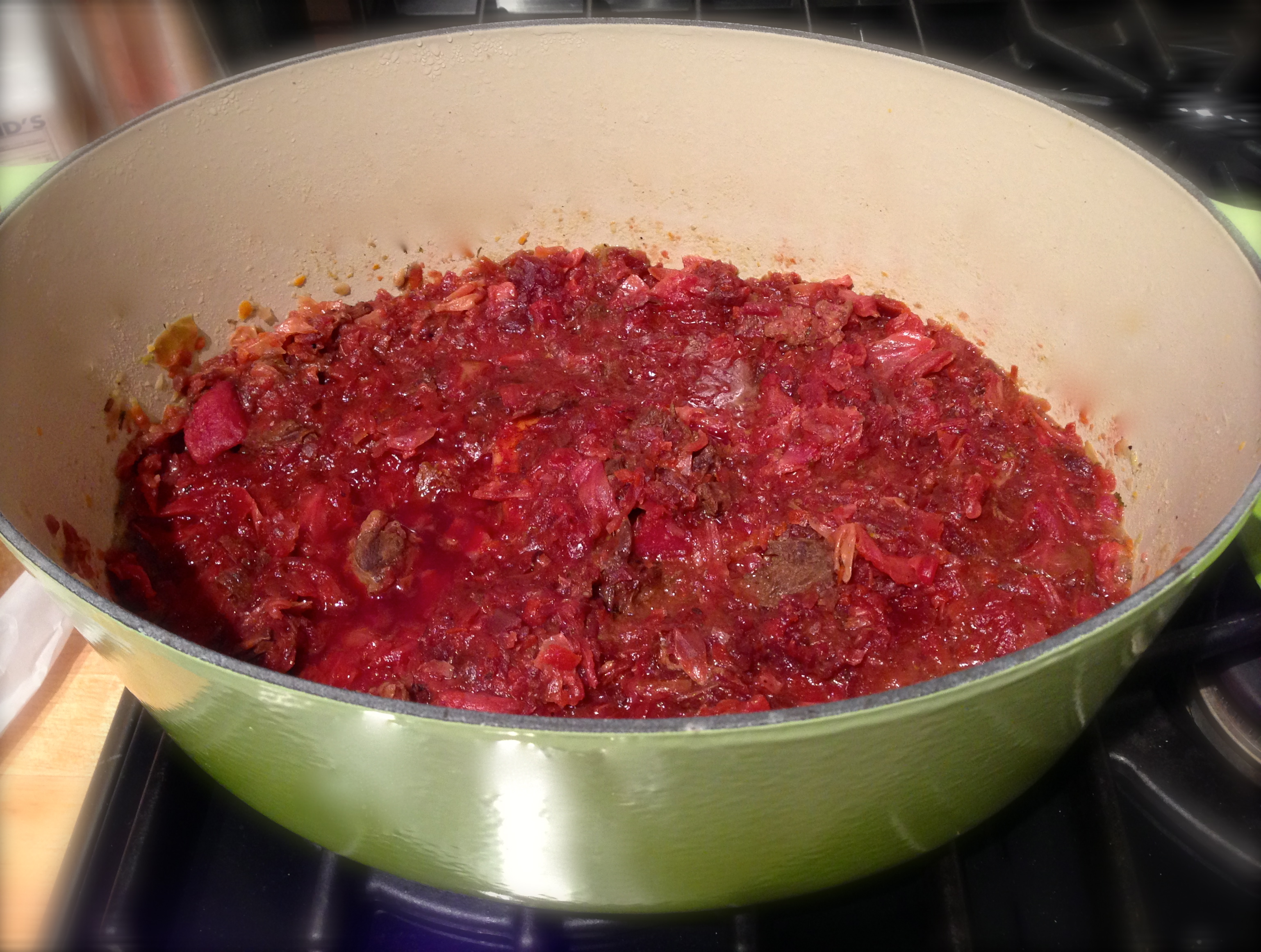 For some reason, the idea of coming in from the snowy wilderness to a warm and crackling fire with a giant pot of borscht seemed to resonate with me. I’ve never even been anywhere at a time of year when this dish would typically be served, but I had some extra beets to use up and had recently watched Rocky IV, which may be an explanation for the image conjured in my mind.