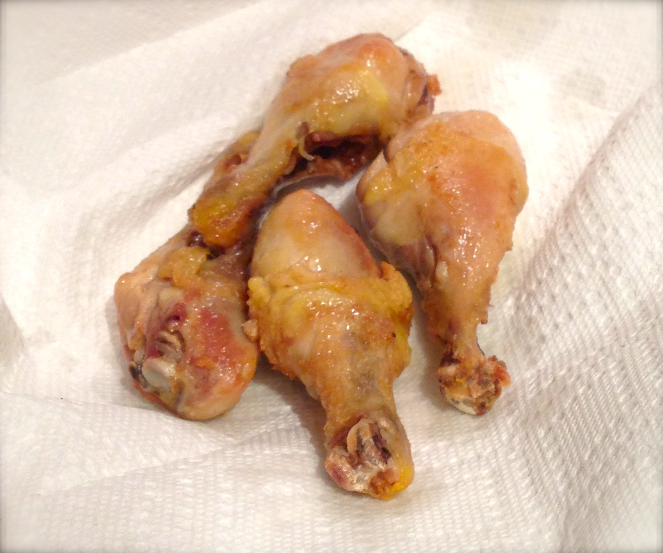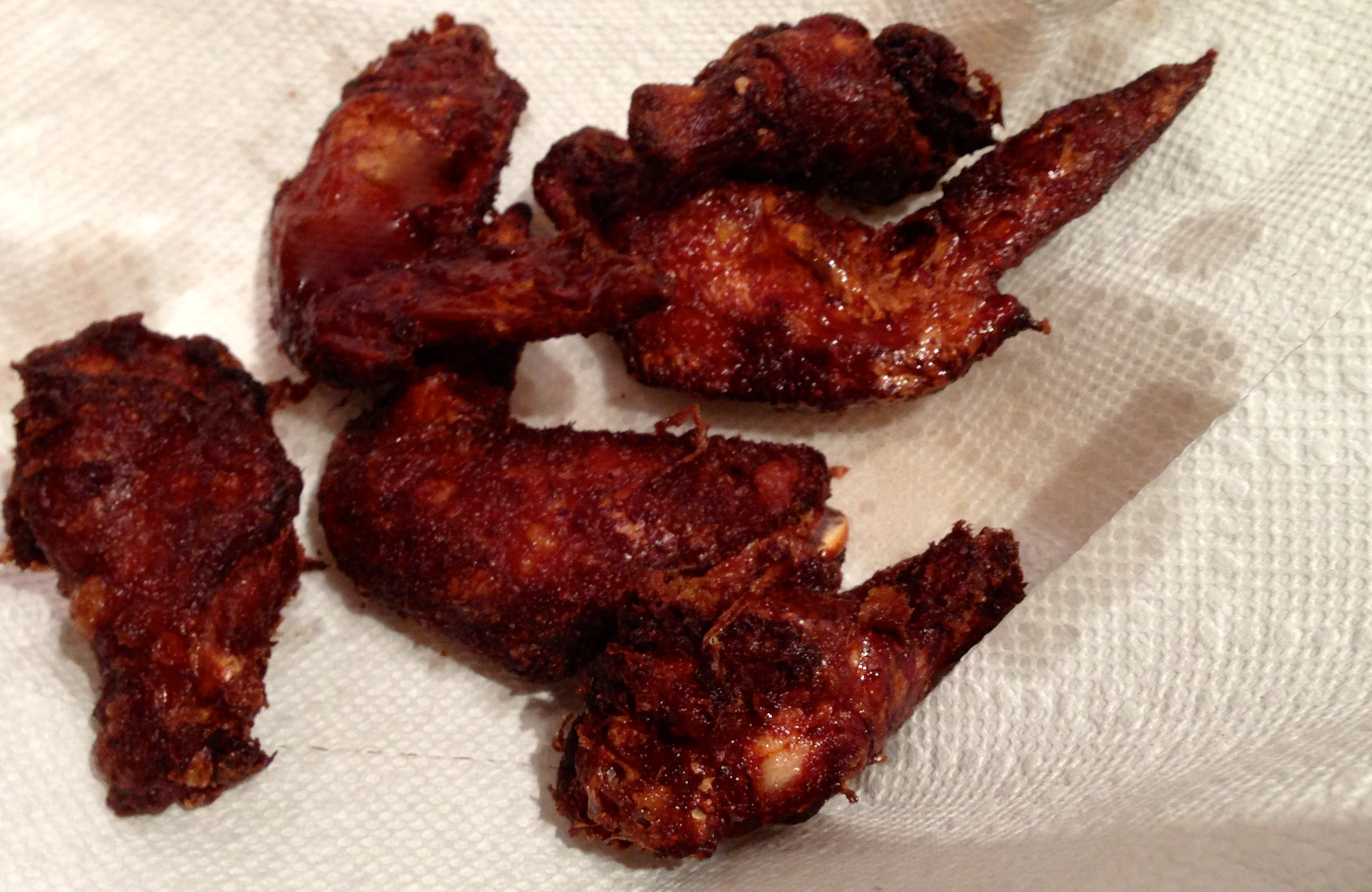 The last step called for frying the wings in “neutral” oil heated to 392 degrees for about 3 minutes. While many types of “neutral” oil are listed in the book, the recipe doesn’t indicate which type they prefer for this recipe. (NB: If you’re going to be specific, then be specific about everything.) Anyway, I used peanut oil, which is recommended for high temperature frying. But my lovely legs did not achieve the promised brownness. Now we had an insurmountable problem. They were fully cooked and even crisp, but not brown.