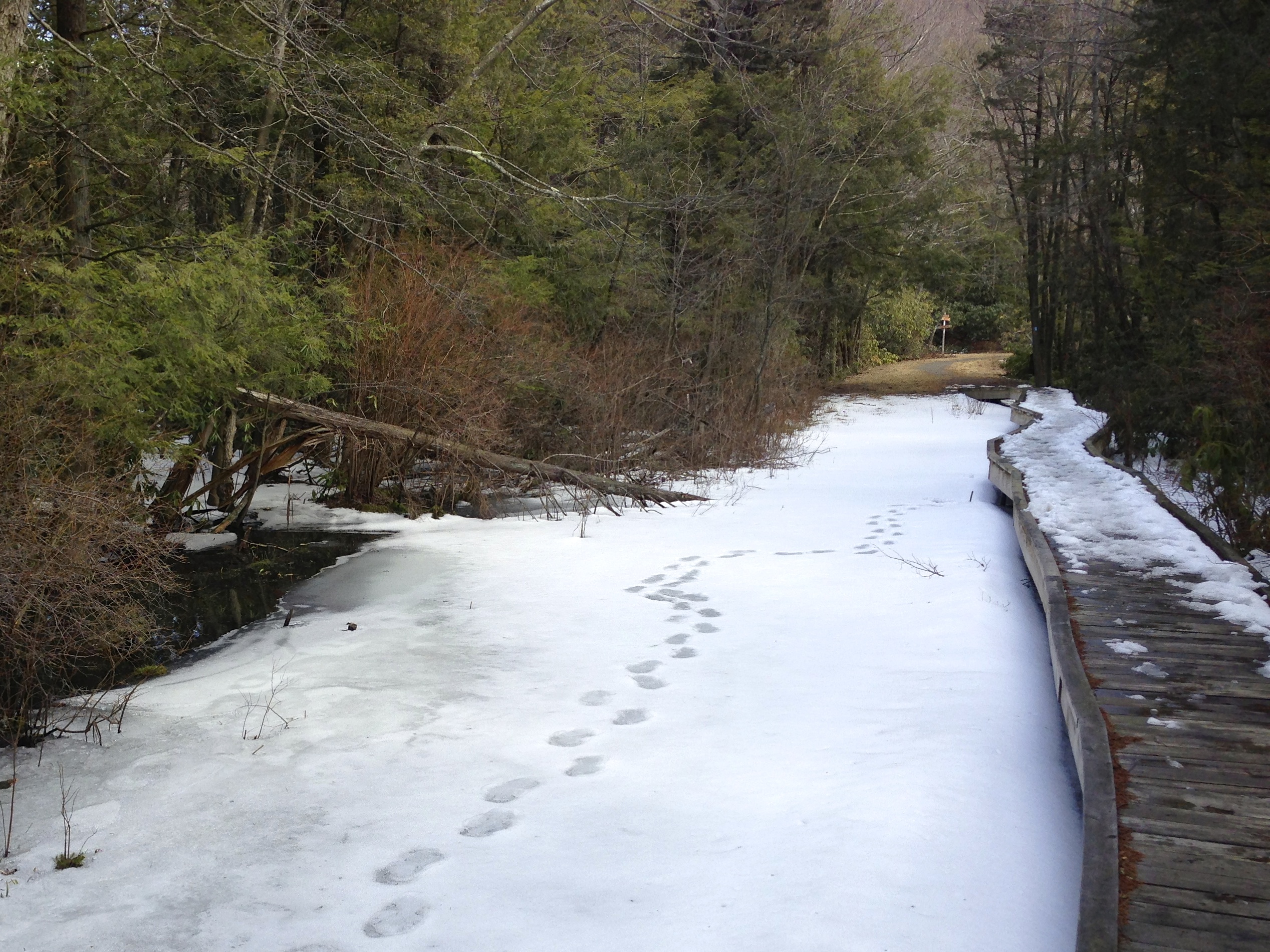 Should use choose the scenic trail, you’ll also pass through the Cedar Swamp, which on our visit was still covered in snow and a little ice from last week’s storm. [Footprints revealed that some chose to walk through the swamp instead of use the bridge. But since the snow and ice had already started to melt, we weren’t about to take that risk.]