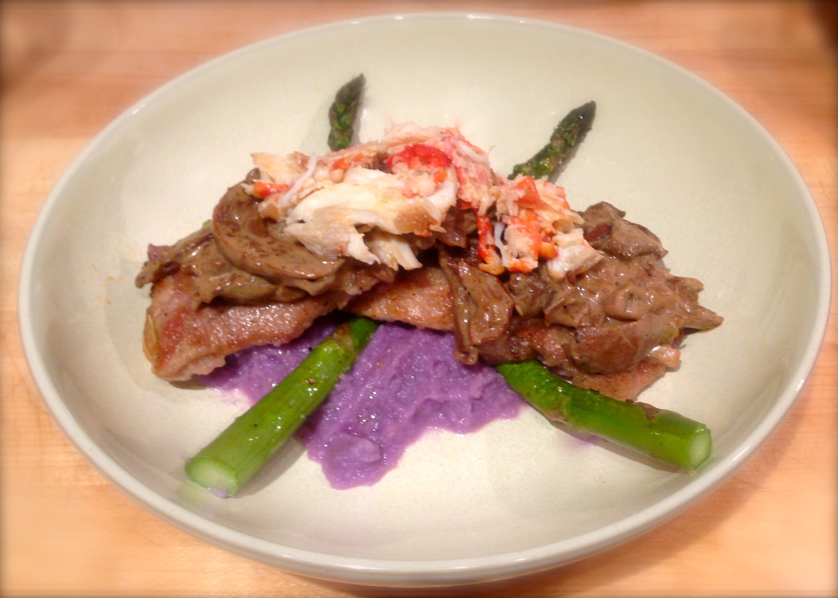 Place a few spoonfuls of the cauliflower puree on a plate, straddle the asparagus spears over it, then top with 2 of the veal cutlets and spoon the mushroom sauce over that. Top with some lump or king crabmeat (it was on major sale!), if you desire. [Note: Initially, I was going to make Veal Oscar but then decided to make the porcini sauce. So the end result was a combination of both and outrageously delicious.]