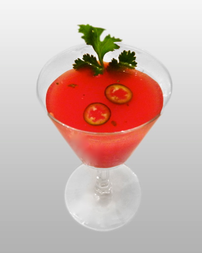Option A: Add ice to shaker, shake for a few seconds and then strain into glass. Add juice to fill and stir. Top with a sprig of cilantro and a thin slice or 2 of jalapeno (seeds removed). Option B: Add juice to shaker and stir. (Do not shake.) Pour through strainer over ice-filled glass and top with a few slices of jalapeno and a sprig of cilantro.