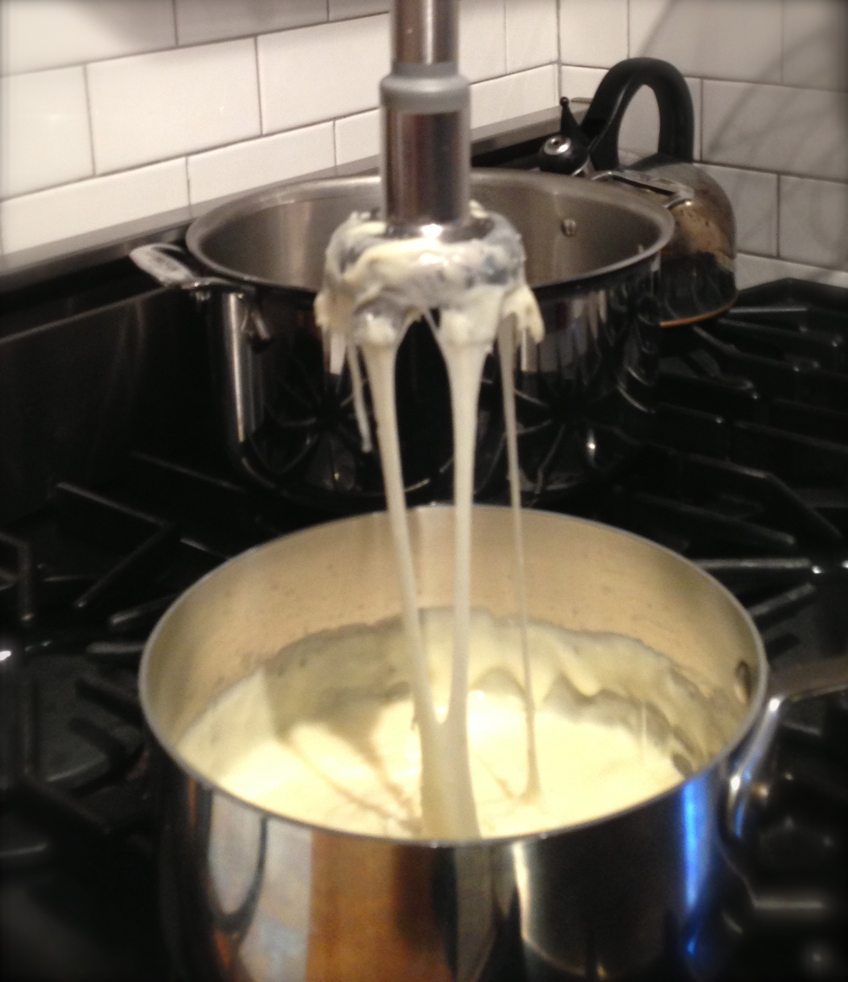 As has been my experience with past attempts at duplicating recipes in MCAH, a few more details would’ve been helpful. The instructions said to use water or milk to blend in the sodium citrate. Once again, there was no explanation of the difference between the two options or mention of what type of milk (from skim to whole). After googling a bit, I noticed that those who used skim milk found it to be slightly challenging. And the pictures in the cookbook showed water. So for this first effort, I went with water. You’ll need to measure the sodium citrate using a food scale. So make sure you have one of those on hand as well as an immersion blender.