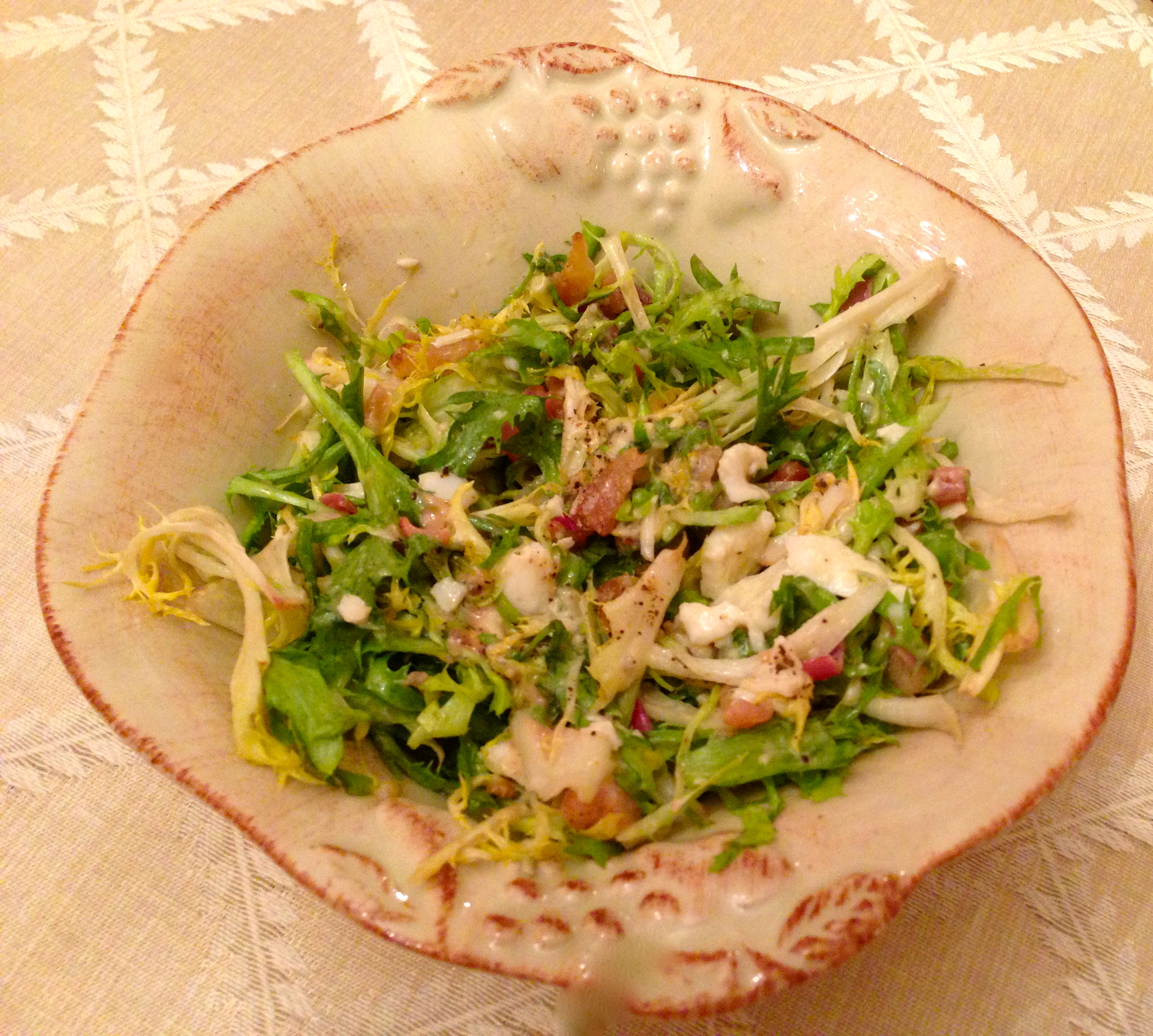 A variation of this frisee recipe may turn up as a main course at a French brasserie, but most home cooks tend to overlook it. So I deemed it post-worthy, especially since I can’t seem to get enough of it lately.