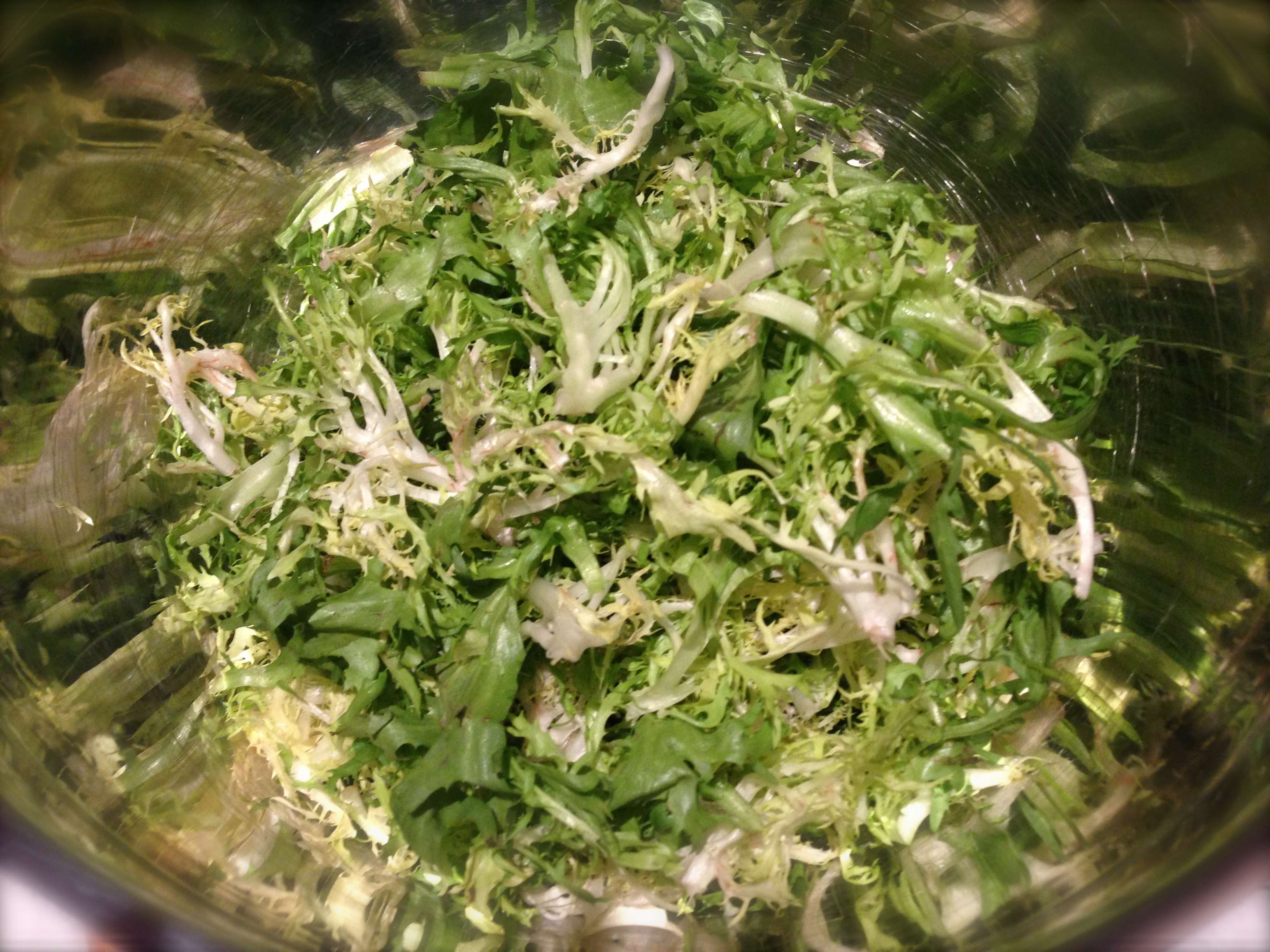Rinse the frisee and chop coarsely. Place in a large mixing bowl.