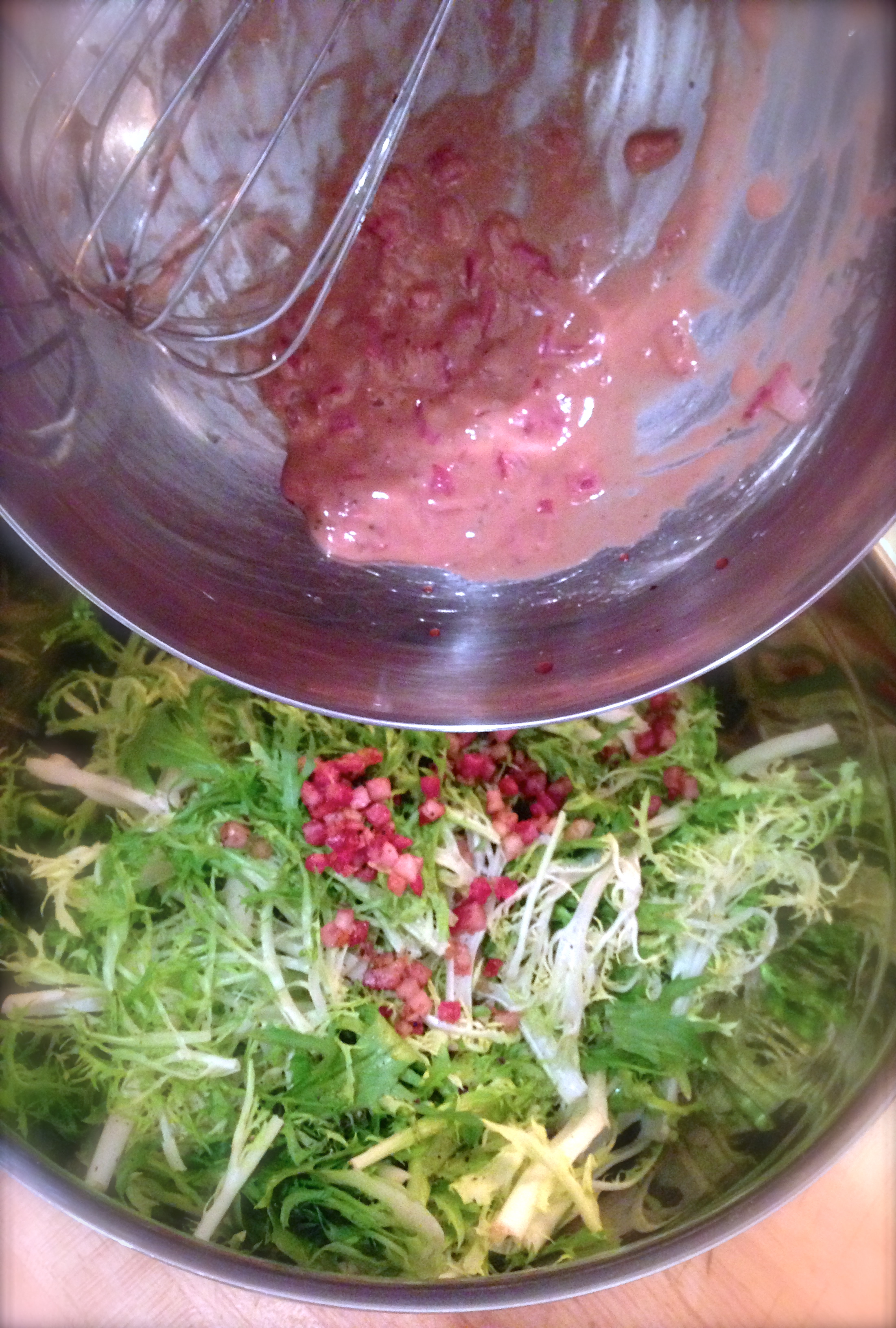 Next add the shallots from pan to the vinegar mixture with a little grease. Whisk. Pour dressing into frisee and toss well. The salad should be wet but not soggy. Mix together more of the vinegar mixture if needed.