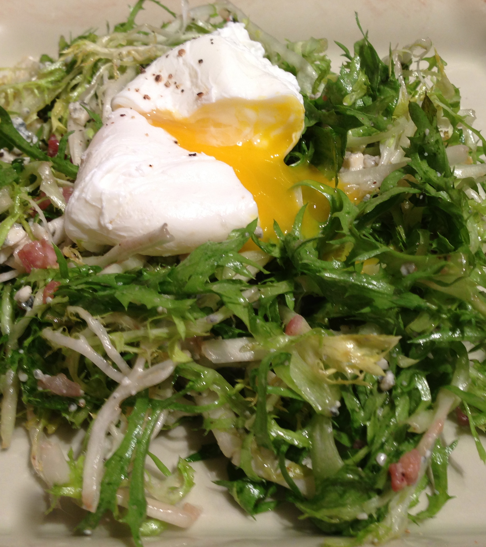Unfortunately, finding frisee isn’t always so easy. But it is essential. You’ll likely have to go to a high end grocer. But nothing else soaks up the dressing and handles the lardons in the same way. The trick to my recipe is adding the shallots cooked in pork fat to the dressing. It cuts the vinegary taste perfectly. And I always add the blue cheese after tossing so it doesn’t soak up too much of the dressing. Adding the poached egg as the last step makes it creamy and irresistible. It’s a couple more minutes of cooking time that is truly worth the extra effort.