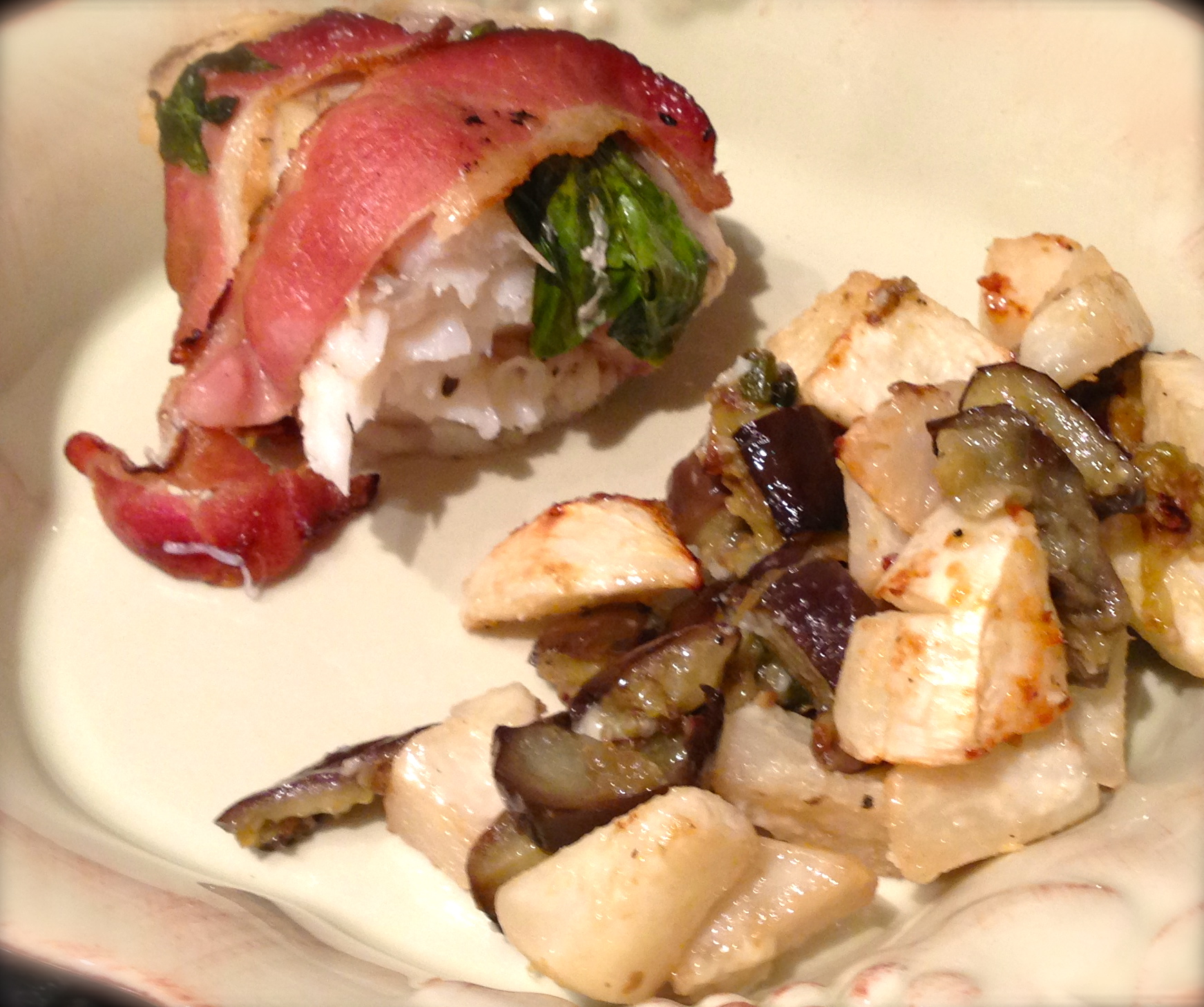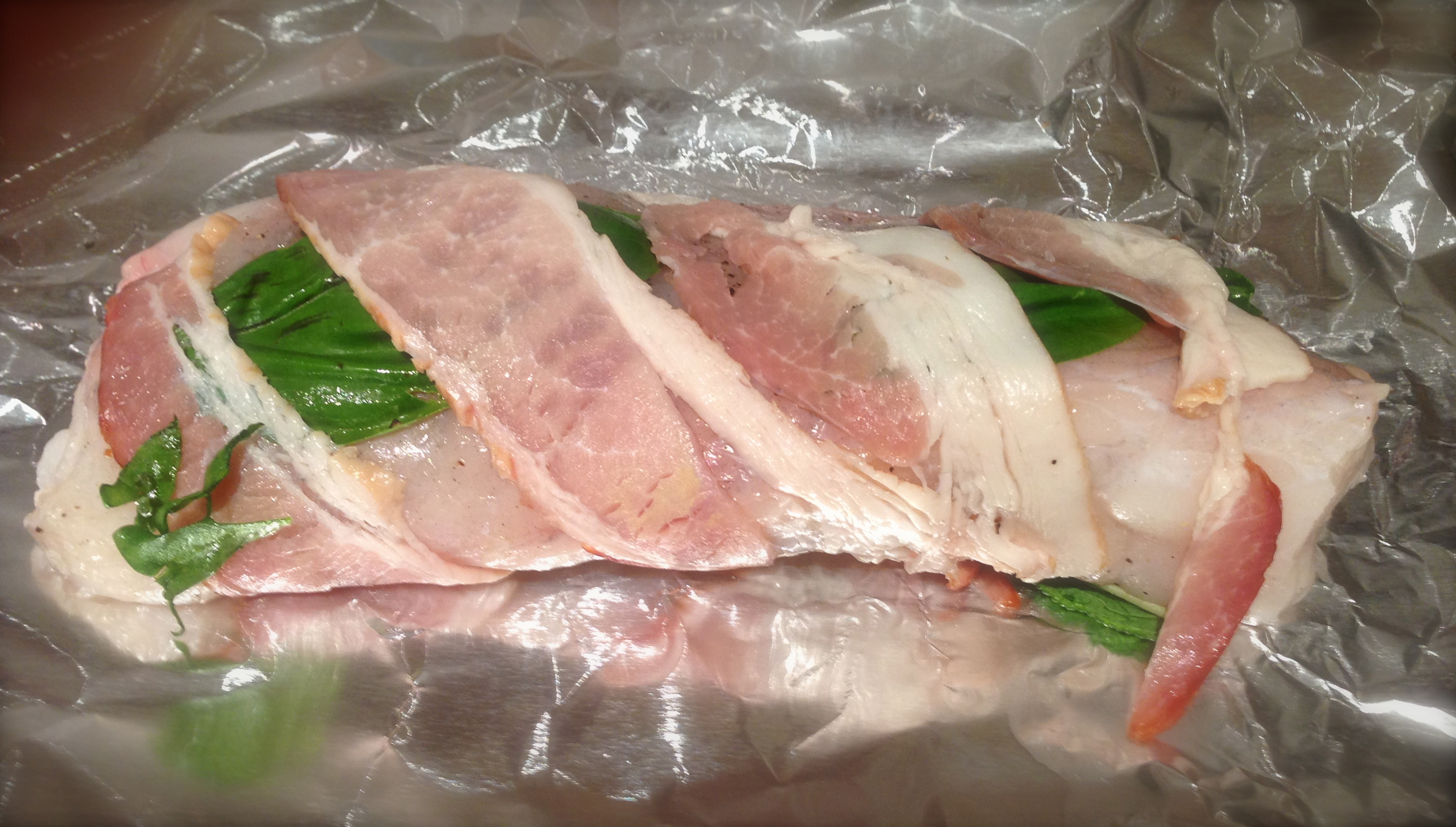 Spiraling the slices to cover fully with bacon can result in overcooked fish to achieve crisp bacon and hide the fish flavor entirely. So I use only a few slices. (I’d recommend using prosciutto or some sort of cured meat product if you cover it completely.) Be sure to have a thick enough piece of fish so that it can withstand the cooking time and remain moist. This recipe tastes as good as it looks and is easy. A great dish for company. Use whatever fresh herbs you have on hand for added flavor.