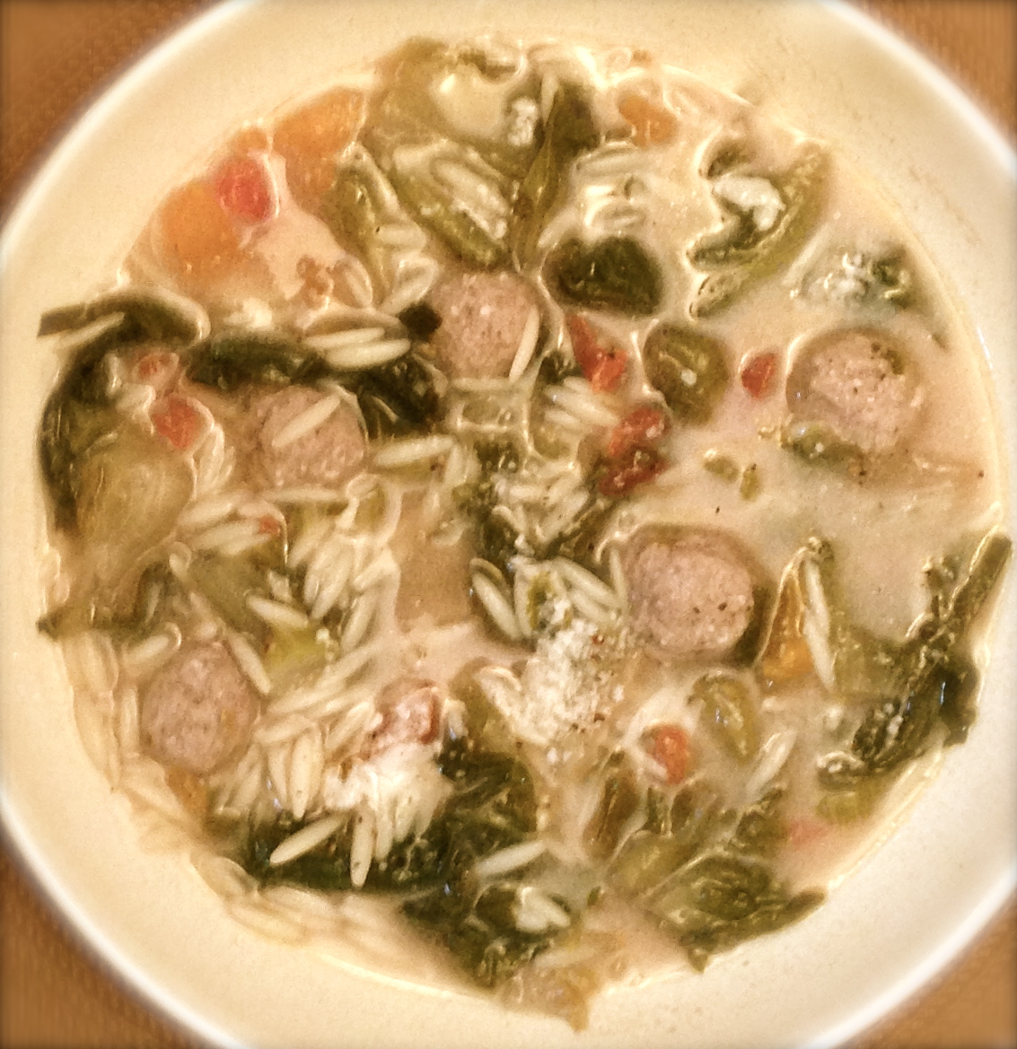 When broth is hot, add the escarole, the meatballs, tomatoes and the orzo. Sprinkle with salt, pepper and a few dashes of red pepper as desired. Bring to a boil, then simmer for at least twenty minutes, but I prefer to let it cook on low for a couple hours so that all the flavors come through.