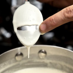 My next attempt went much better. I used manchengo and sharp cheddar. And I kept the heat constant enough to keep the cheese melted without burning (medium-low on my powerful burner). The result yielded a consistency where the cheese dripped off the spoon – just like it did in the MCAH display photos!