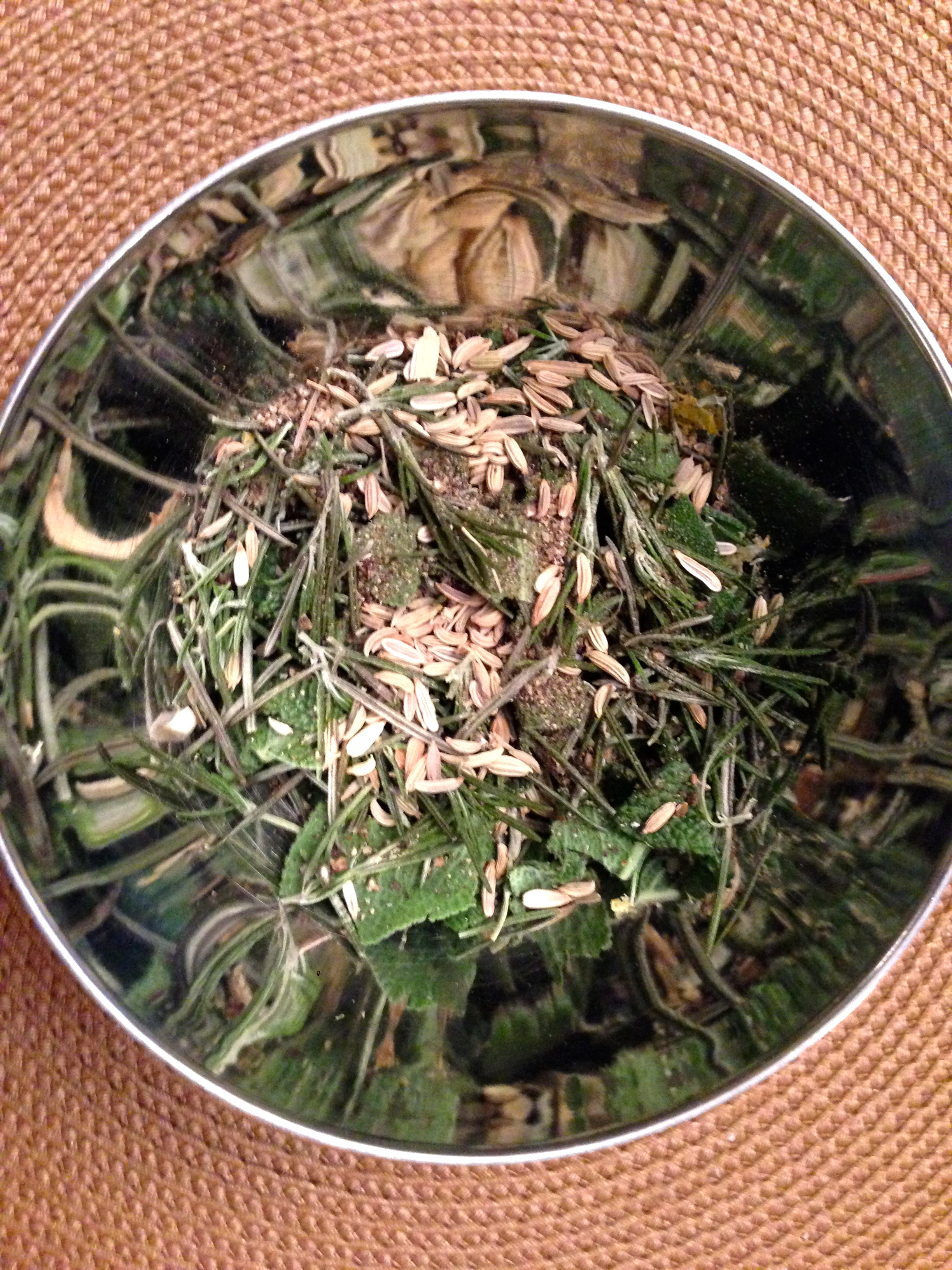 Mix the herbs, lemon zest, garlic and fennel seeds together.