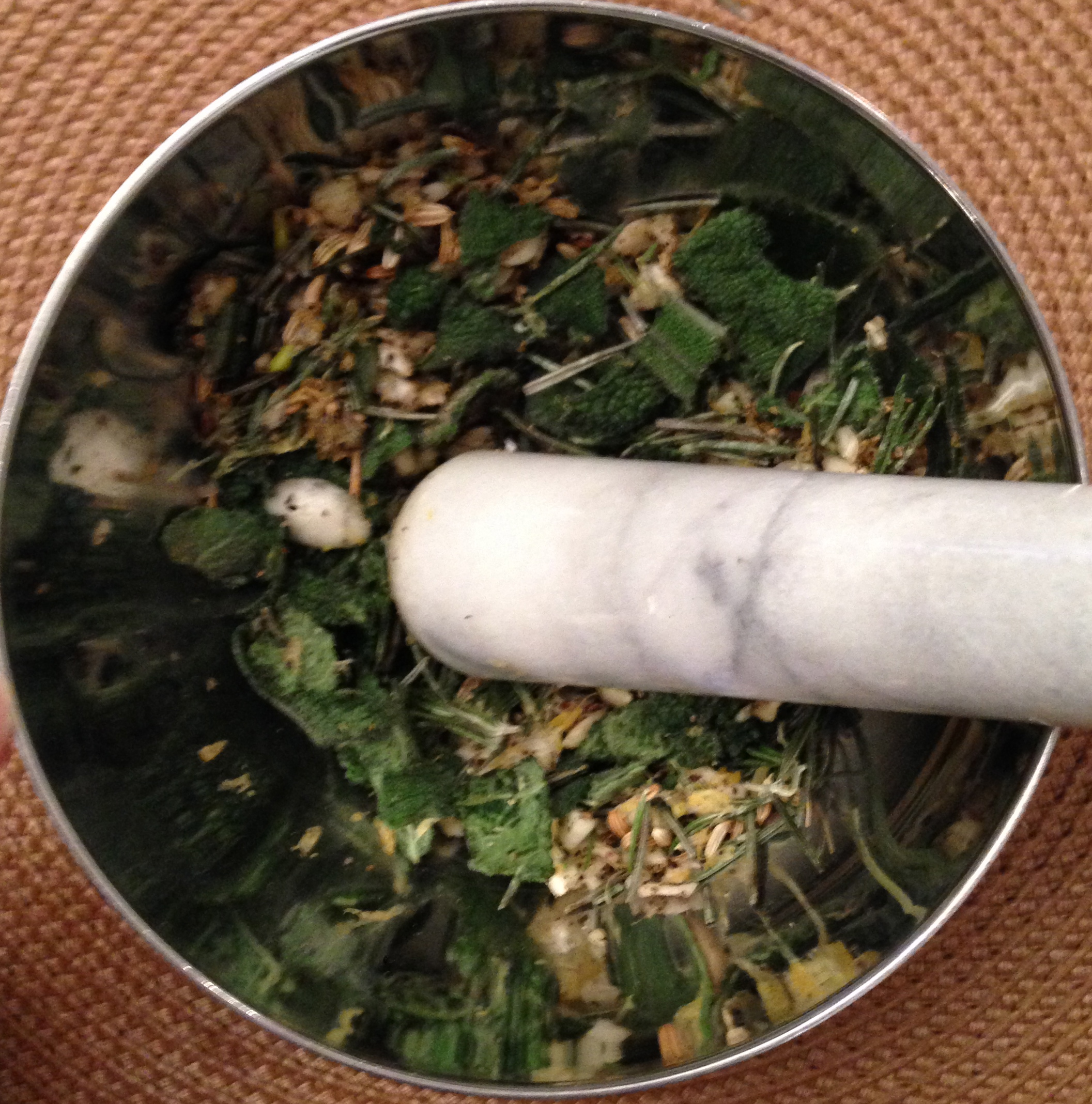 Make a few slits in the pork, sprinkle it with salt and pepper. Rub the herb mixture all over the inside. (Note: I did not add any oil to the mixture so that it would not cook the meat.)
