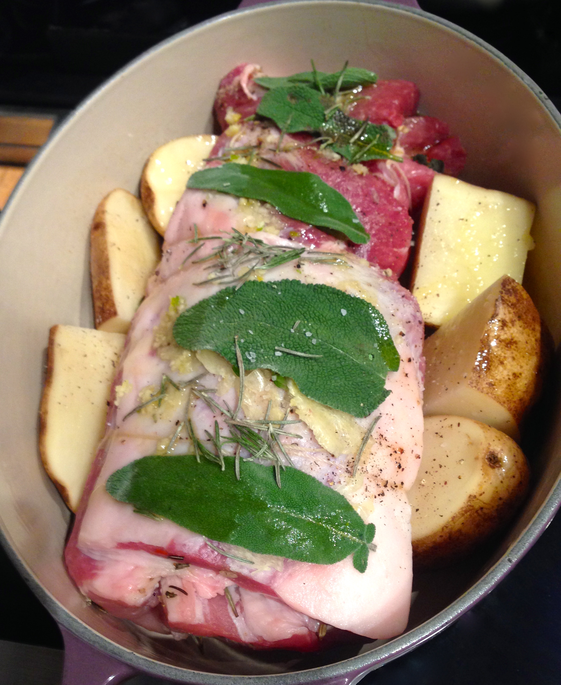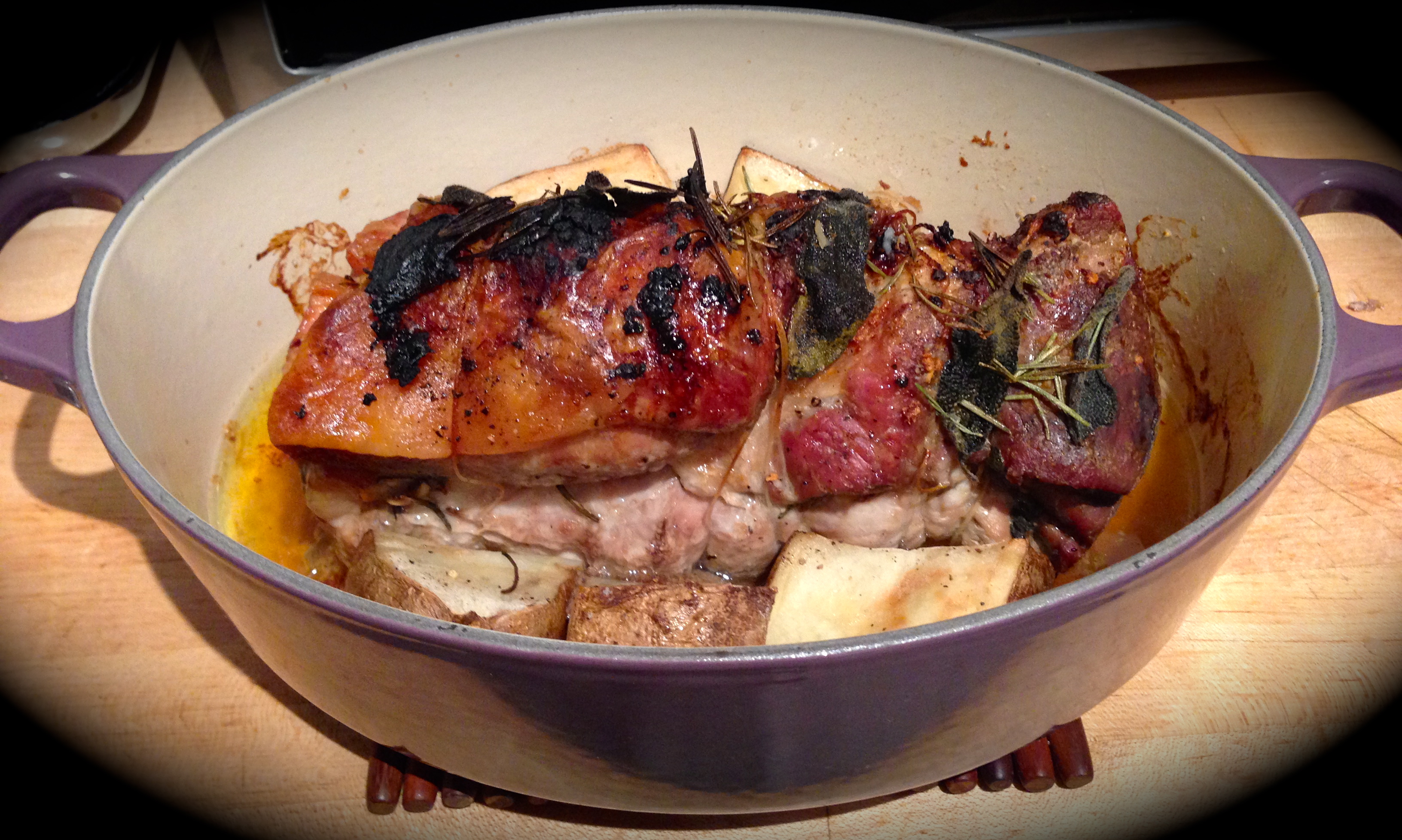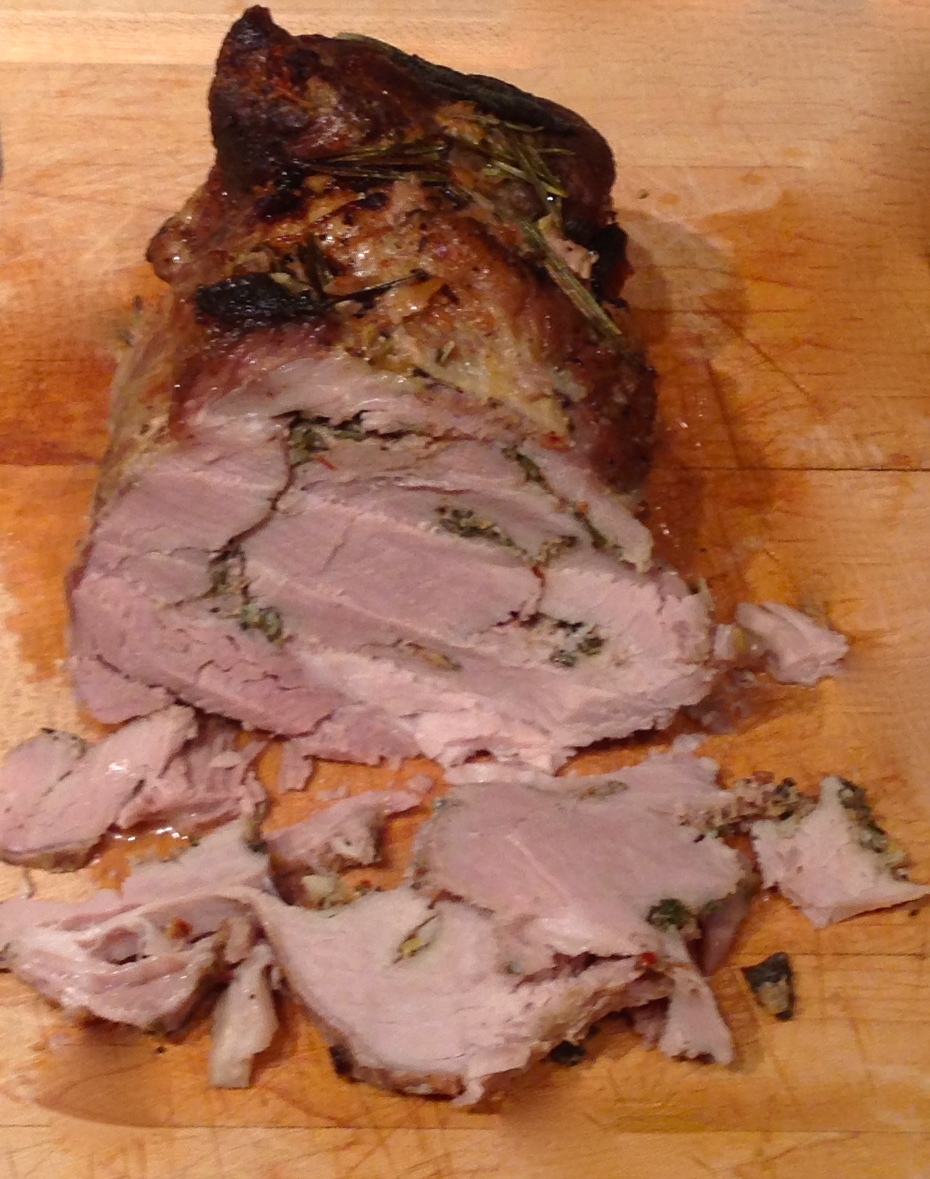 Tradition in my house calls for pork on New Year’s Day. I usually make Apricot and Sausage Stuffed Pork Tenderloin – but that wasn’t going to work without my Viking. So I decided to pay homage to Judy Rodgers and opt for a version of her mock porchetta (mock because it doesn’t use a whole pig) that also happened to fit in my toaster oven.