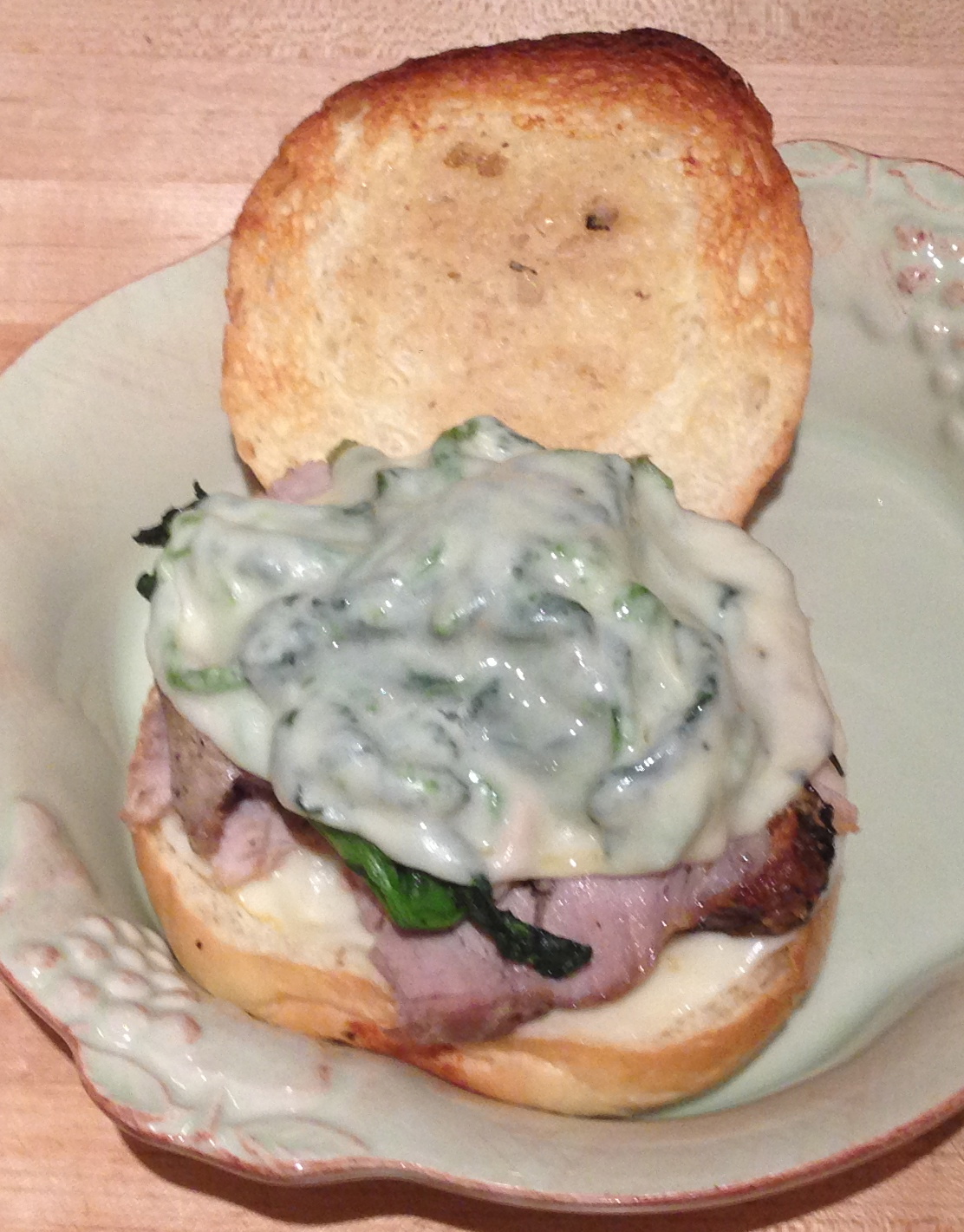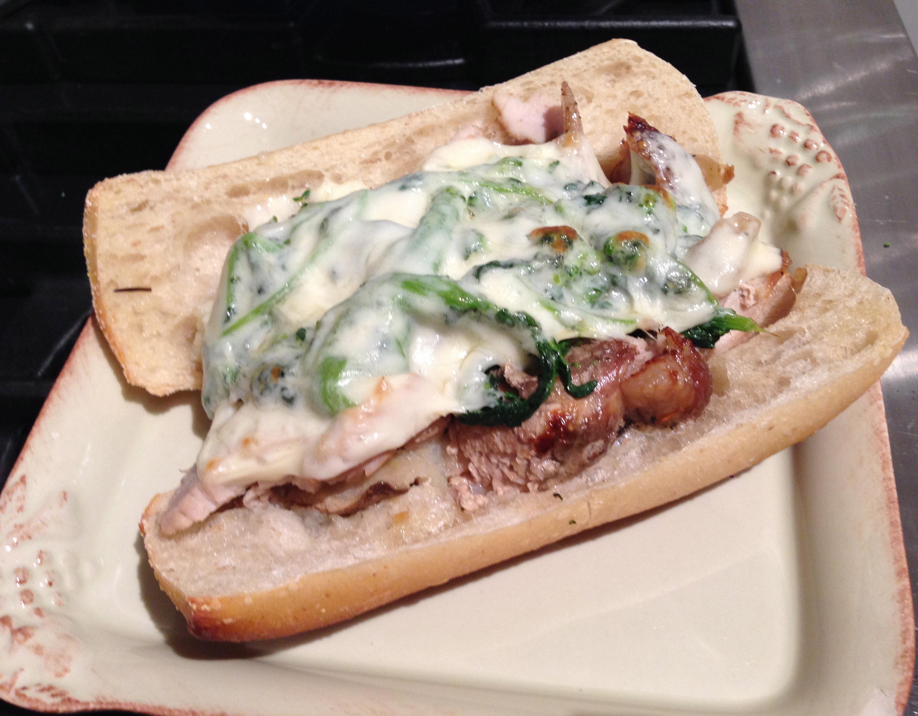 Of course, I departed from the Zuni recipe in a couple of ways. First, I used a larger cut of pork loin because I wanted leftovers and didn’t agree that it would be tough. Second, I added some red pepper, which you will find in most other versions, and omitted the capers because I’m not a fan. Third, I used my Le Creuset small braiser because the cast iron pan wouldn’t fit in my toaster oven. I don’t think this dish suffered from any of my changes. It was super easy to make and absolutely delicious! To keep it simple (who wants to fuss on New Year’s day?), I also took some inspiration from DiNic’s and made sandwiches with sauteed broccoli rabe and provolone. Perfect for a day of football watching.