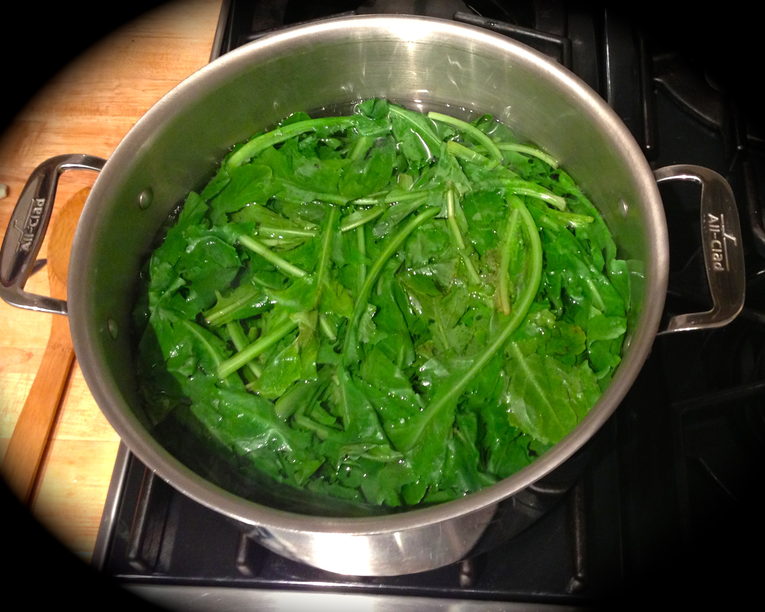 Heat a large pot of salted water till boiling. Add dandelion greens and blanch for 4 minutes.