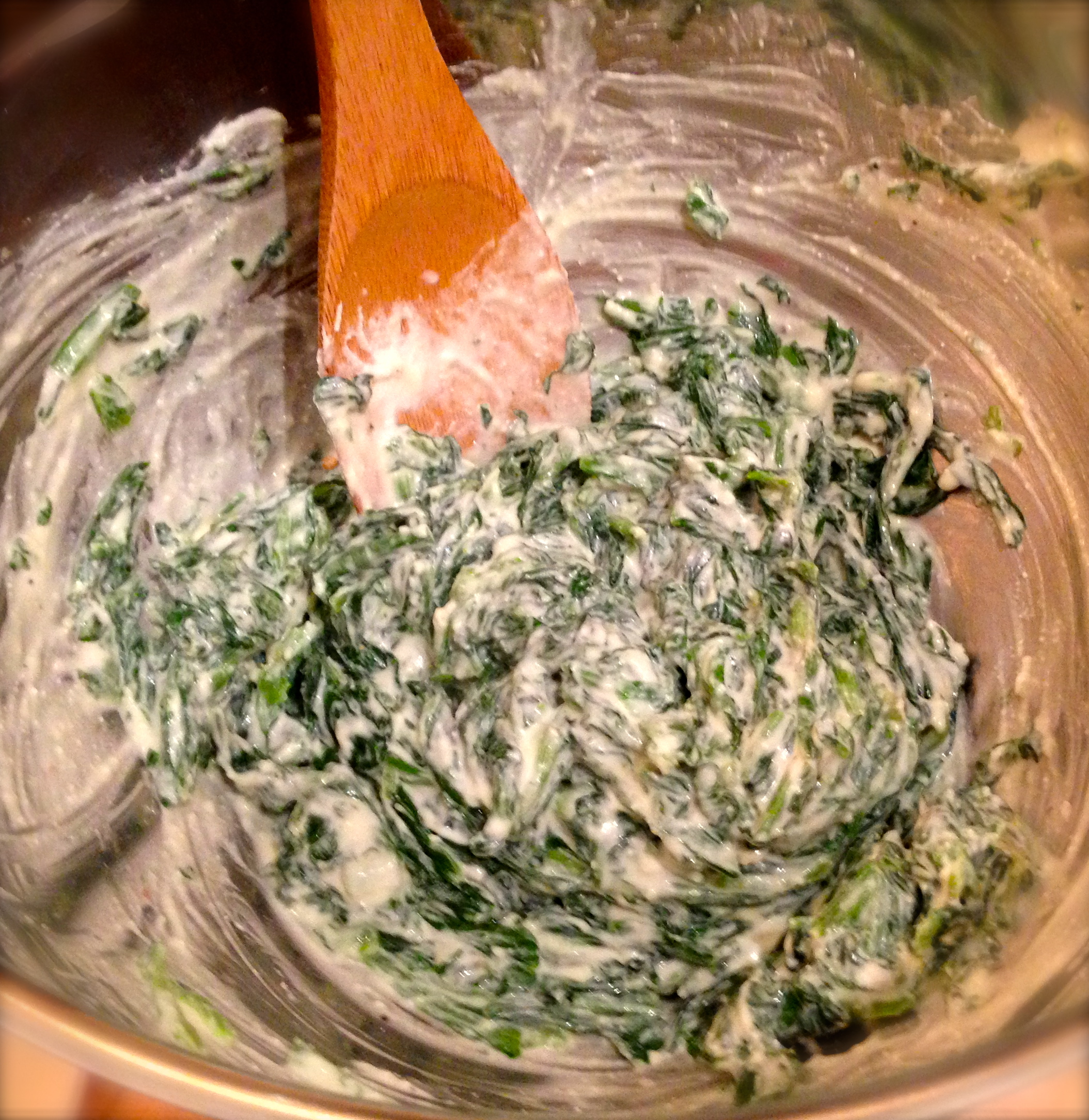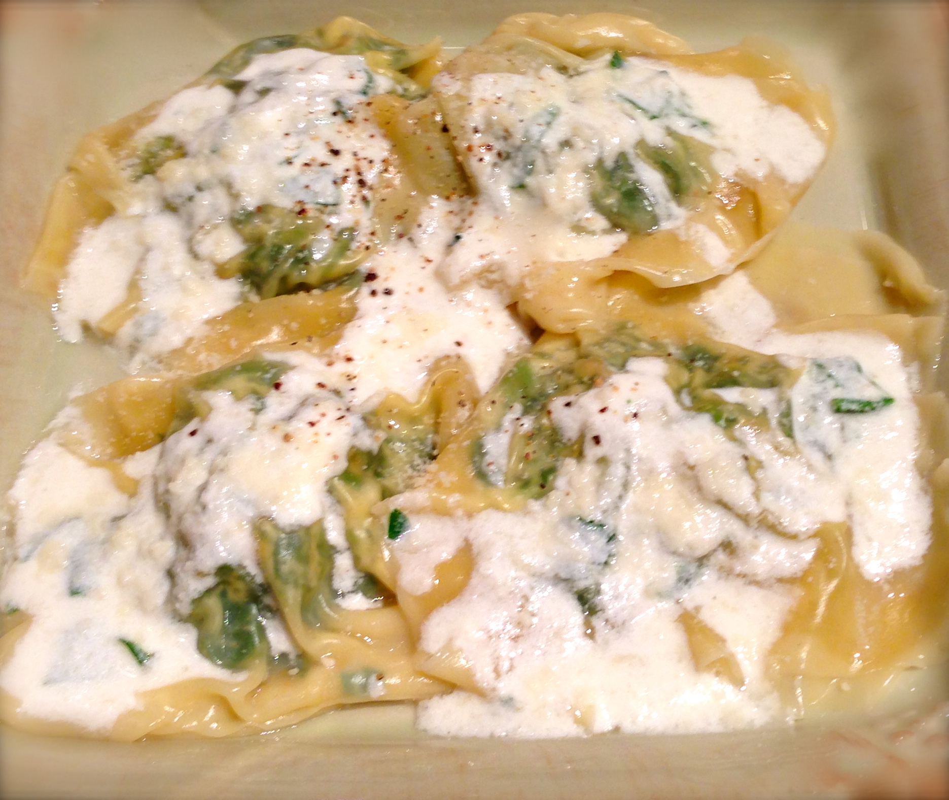 Remove to a large bowl and let cool. (After a taste test, I had a hard time not eating all the greens at this stage. They’re delicious this way if you don’t want to bother with the rest of the recipe.) When cooled, add the ricotta, parm and egg. Stir to mix thoroughly.