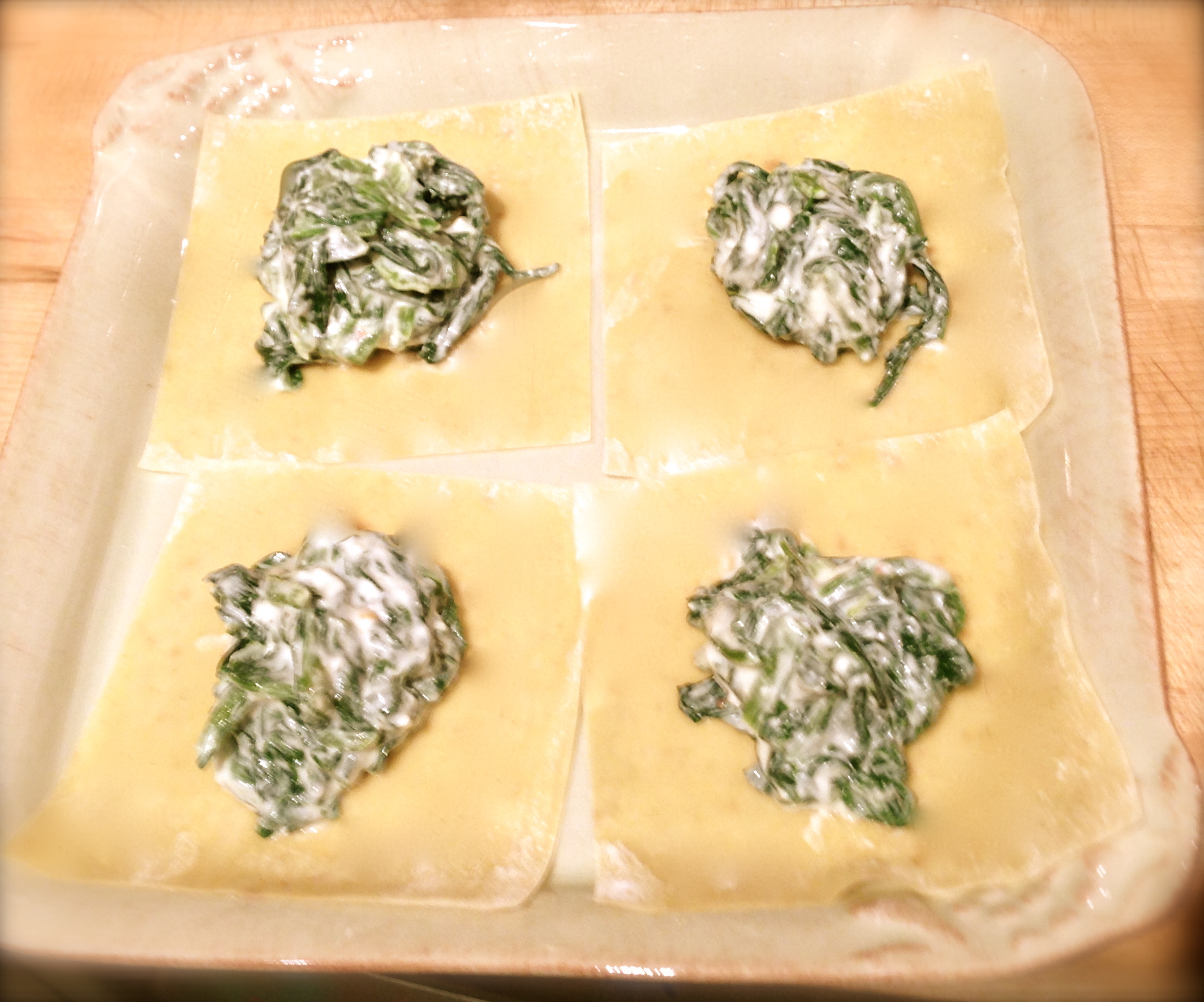Brush your pasta sheets with water (or a beaten egg) and top with a teaspoon or so of filling.