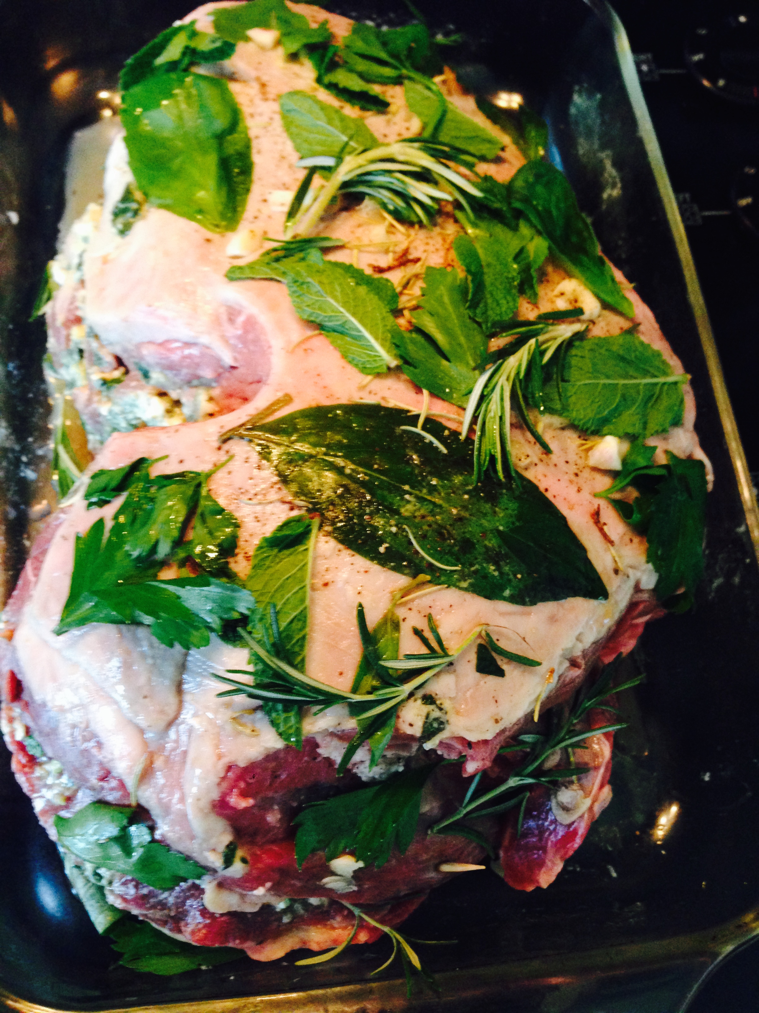 Then when I moved to NYC, I’d fight hours of traffic for a taste of Mom’s ham. One year, my parents came up here, and we got tickets to St. Patrick’s – more for entertainment than religious reasons. I decided to try something new, and stuffed a boneless leg of lamb with greens and feta – starting my own traditions (the origins of the recipe posted last week).