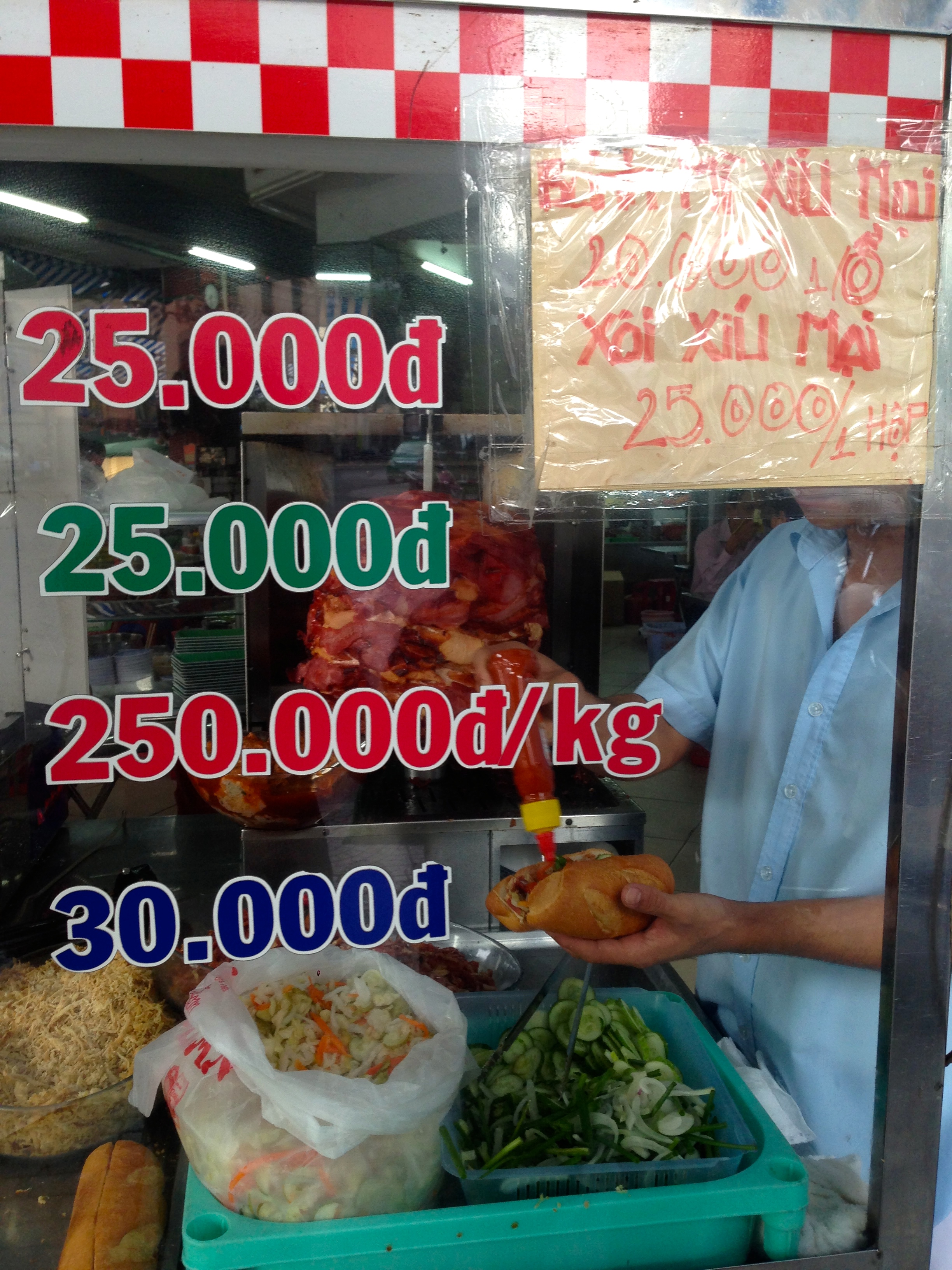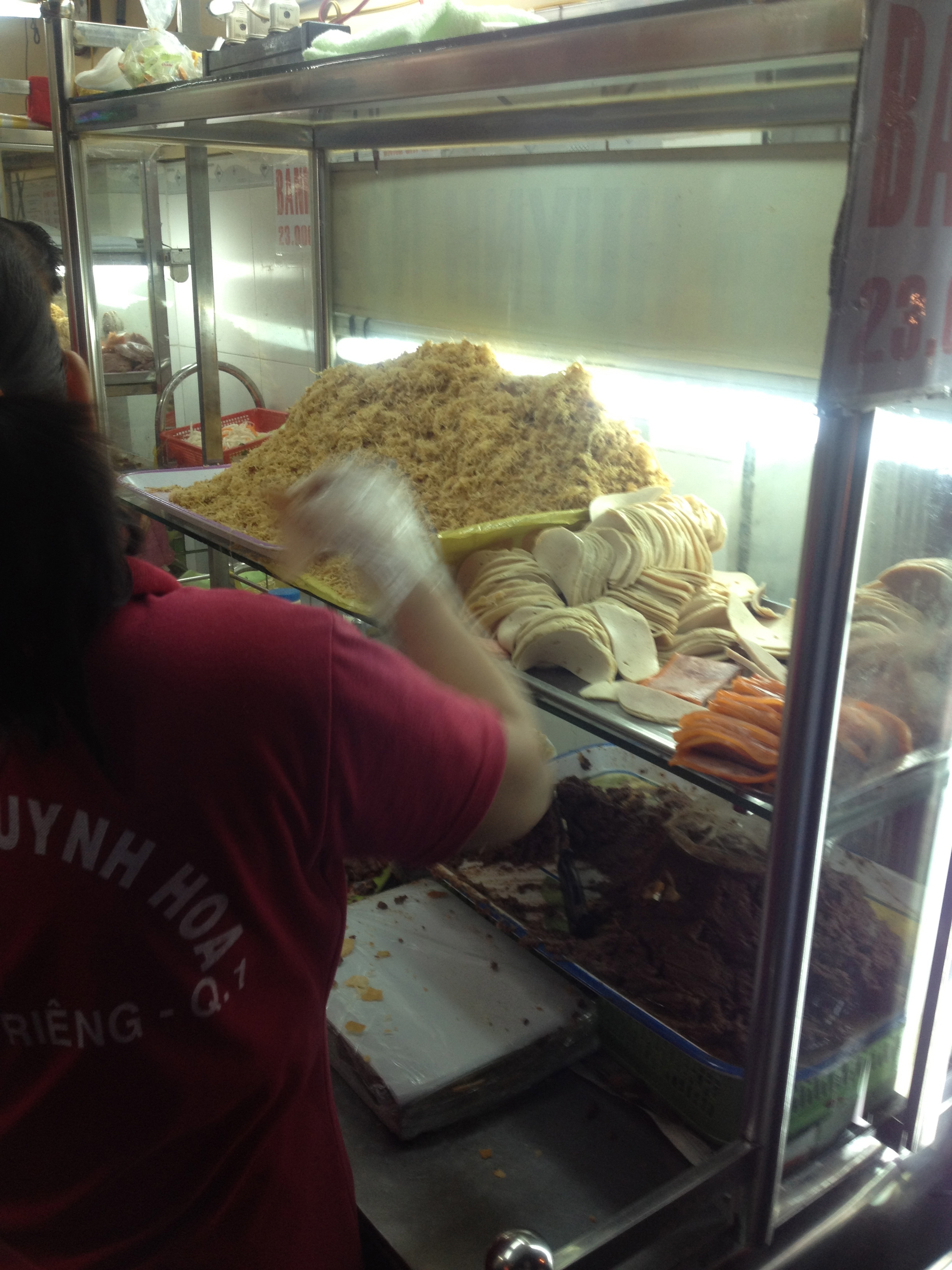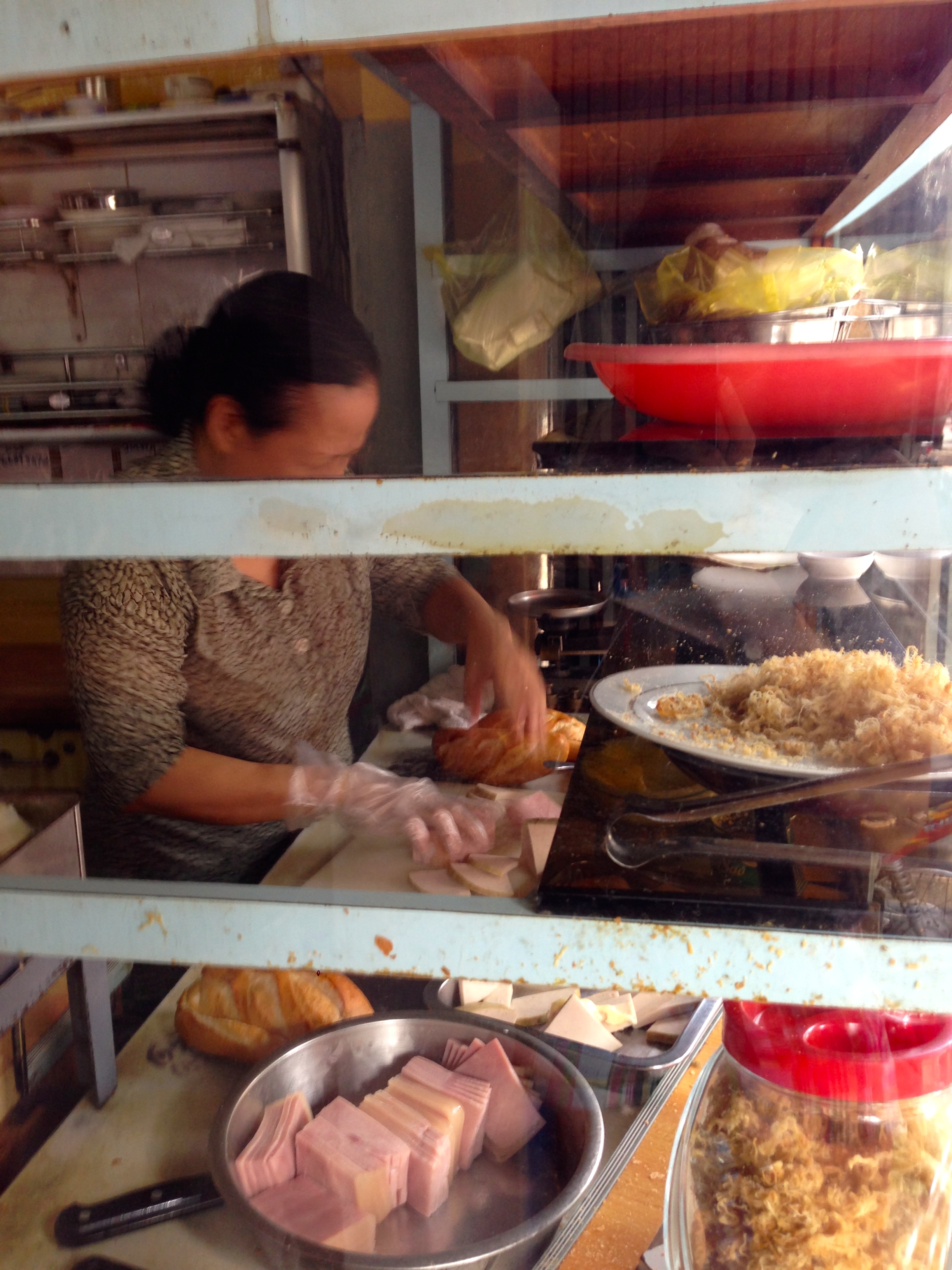 Hungry one morning and with no time to go running around before our Mekong Delta tour (post to come), we walked around near our allegedly 4-star hotel in District 1 searching for a busy place.  A block or so before the river we found a bakery and place to purchase deli meat for bahn mi – SCORE!