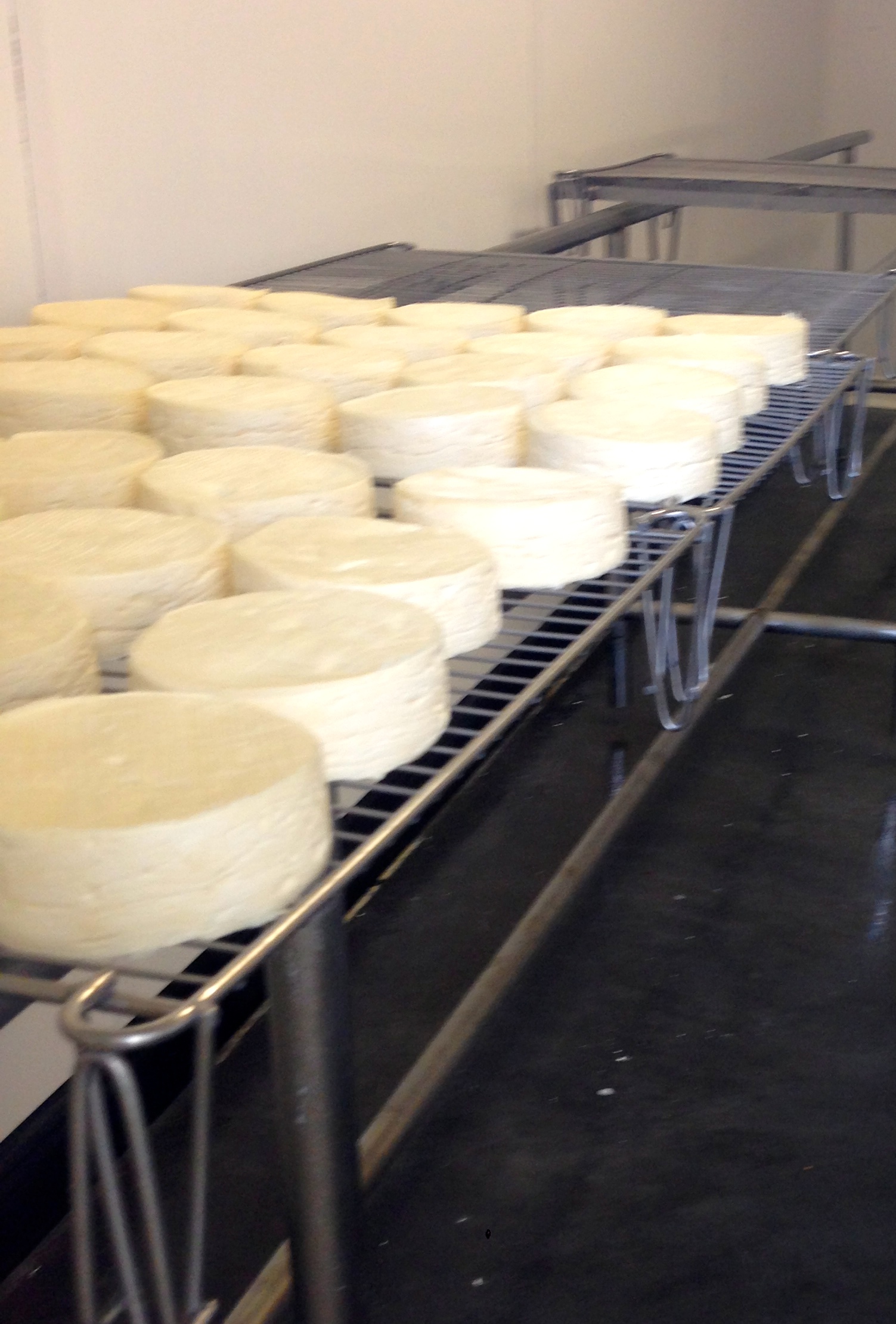 They produce about 600 Camemberts a day, which are ladled into molds during the day, flipped in the evening, and the molds are removed in the morning. Then the cheese is trimmed, salted and sprayed with penicillin.
