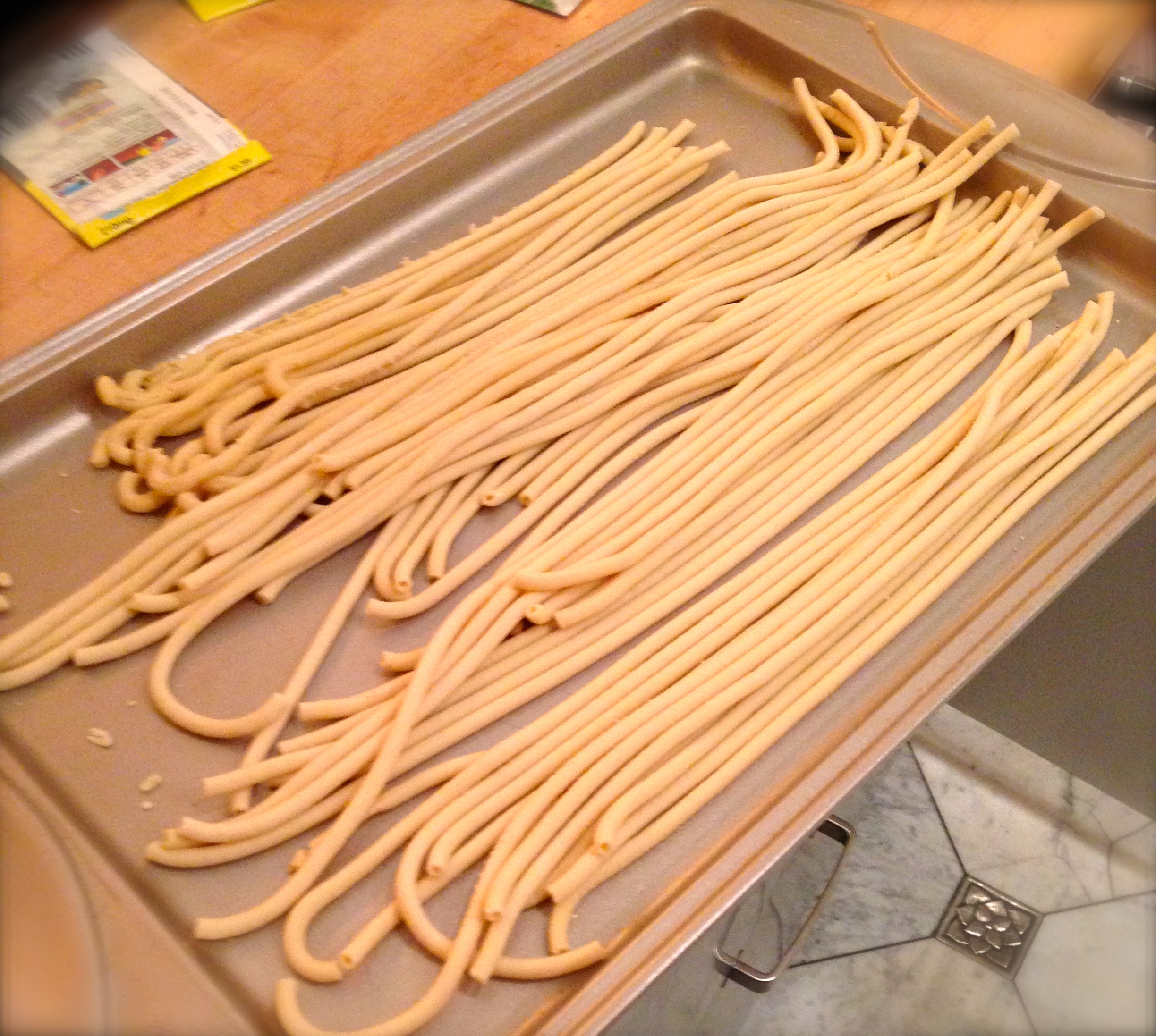 Either put through the press or if using the attachment, decide which plate you want- spaghetti, bucatini, rigatoni, fusili, macaroni….and insert the plate. When ready, put small chunks of the dough into the attachment.