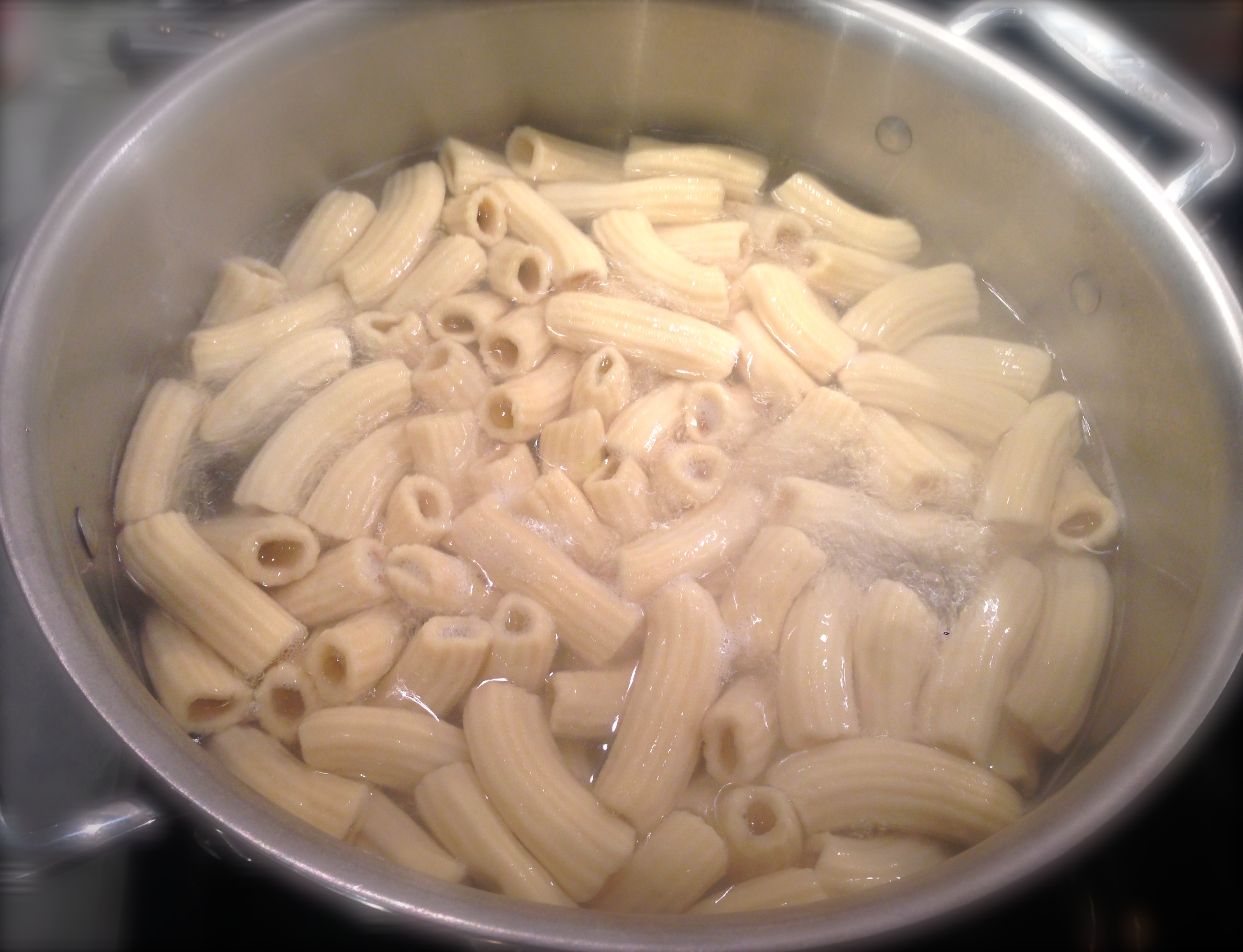 When the sauce is cooked down and the pasta is ready, bring a large pot of salted water to a boil. (If cooking pasta right away, add a drop of olive oil to the water.) Add the pasta. Cook for 3-5 minutes depending on thickness of pasta. It should rise to the top quickly, but will still need to cook a little more. Rinse with cold water. Toss with olive oil to prevent sticking.
