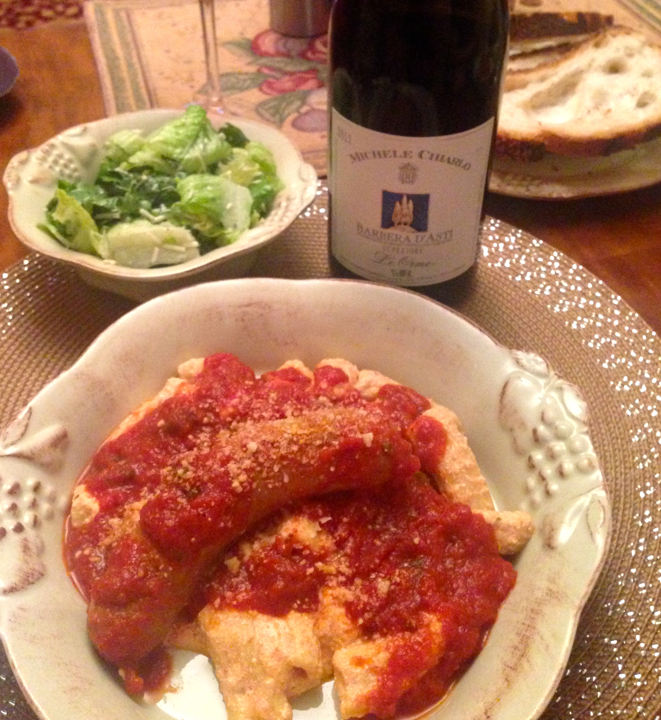 As the nights cool off, you can finally tolerate the heat of the kitchen again. And you have the best ingredients available: Field grown tomatoes and basil for fresh marinara sauce. And of course a salad is the perfect accompaniment should you have lots of lettuce and cucumbers lying around. But the key is the pasta itself.