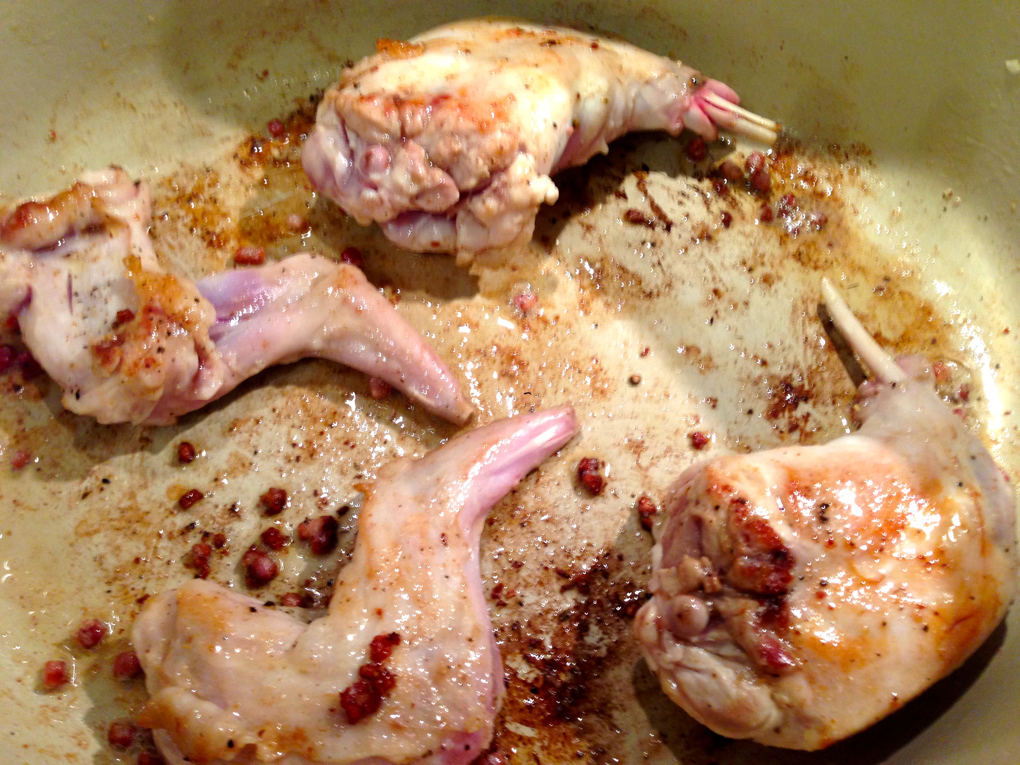 Since this rabbit was whole, my first step was to attempt to butcher it. I did fine with the legs, but the rest was a little less than perfect. I was mostly concerned with not wasting meat, so I did my best to use everything. But I’d recommend asking your butcher to cut it into pieces, if possible. Once the rabbit is butchered, sprinkle it with salt, pepper and thyme.