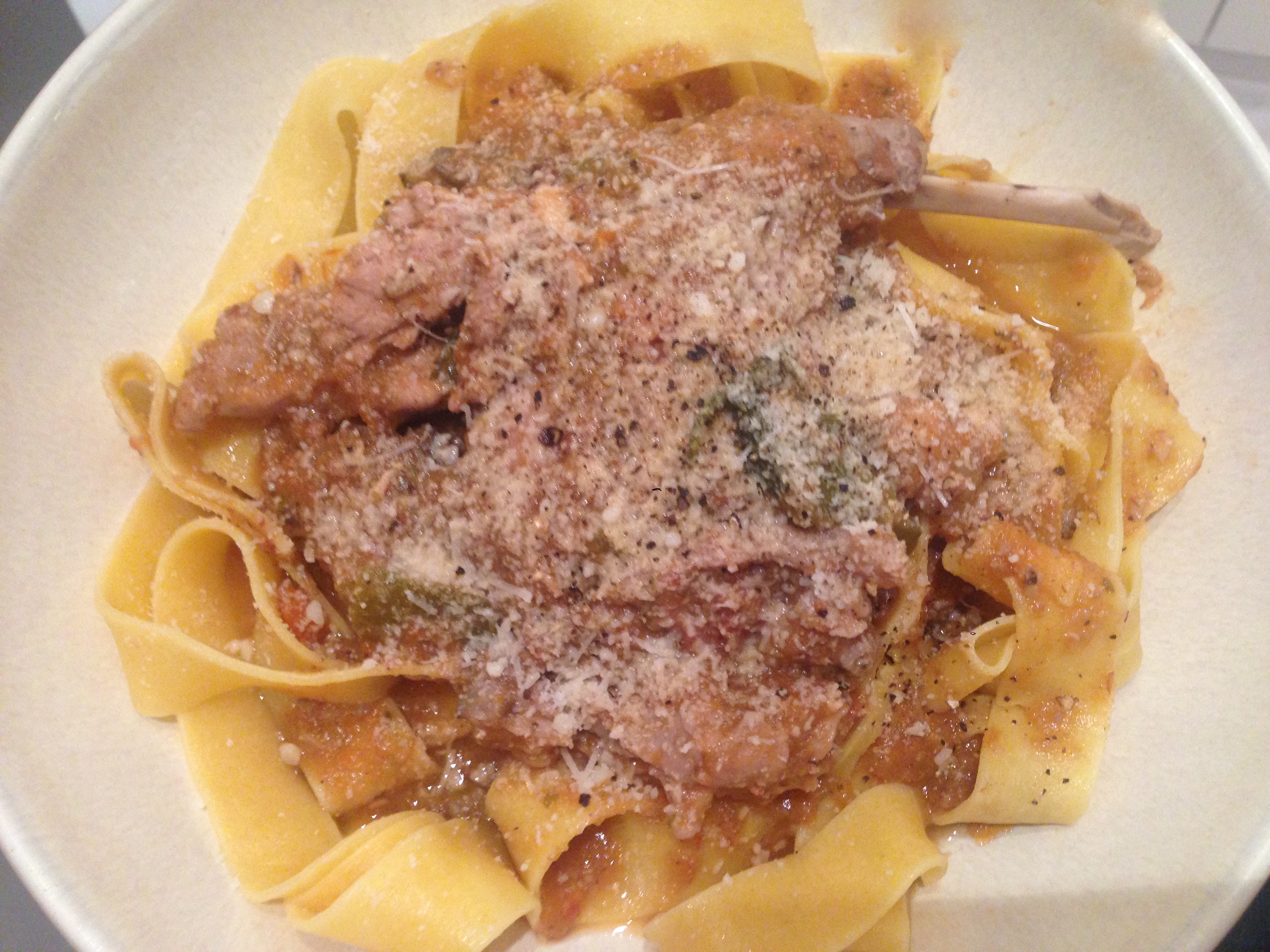 Plate the pasta and top with the rabbit and sauce. Sprinkle with parmigiana, if desired.