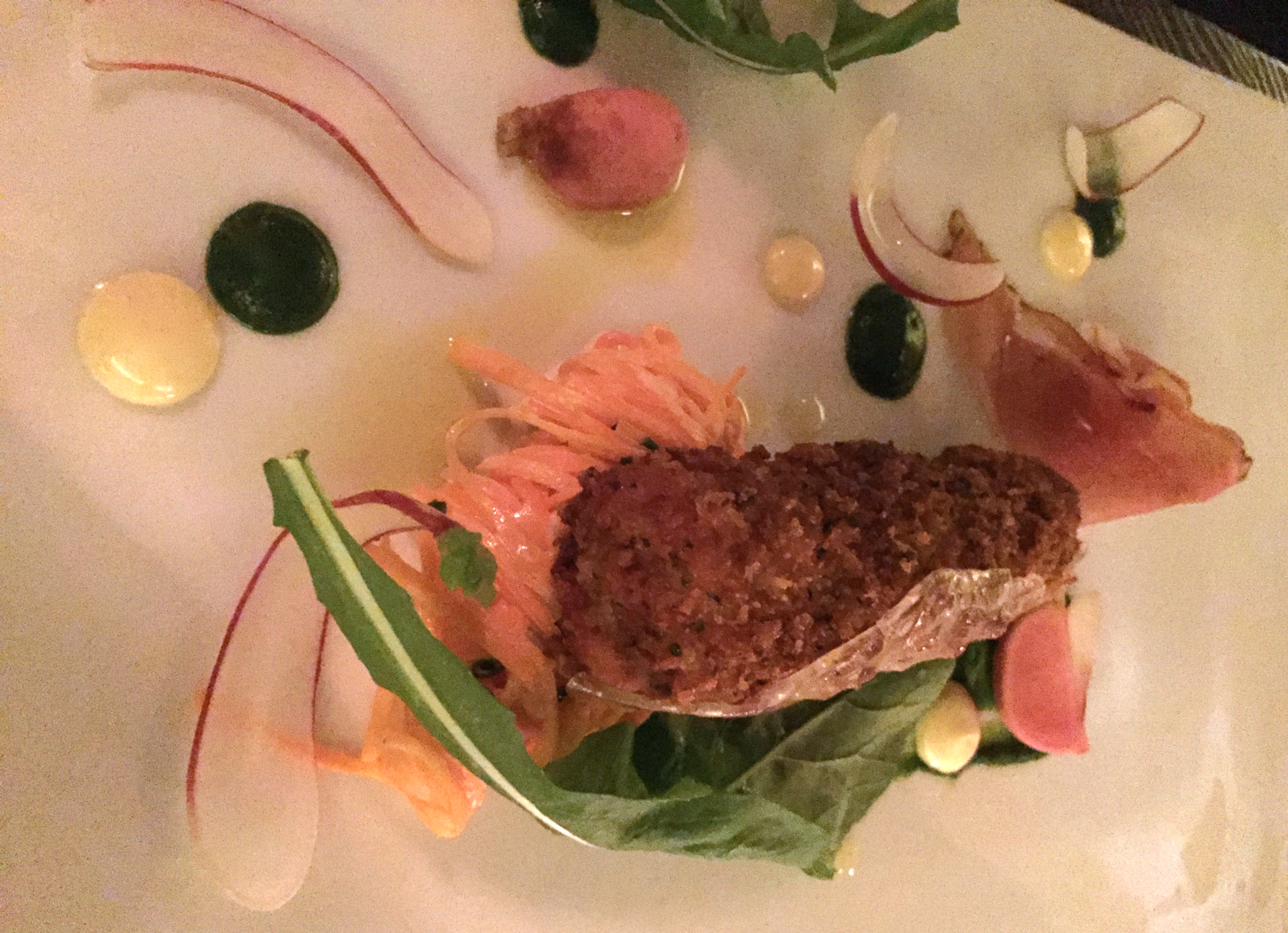 The tete de cochon was the other choice. Rolled in panko it was crispy, not unctuous and well-seasoned, besides being plated beautifully with radishes and arugula.