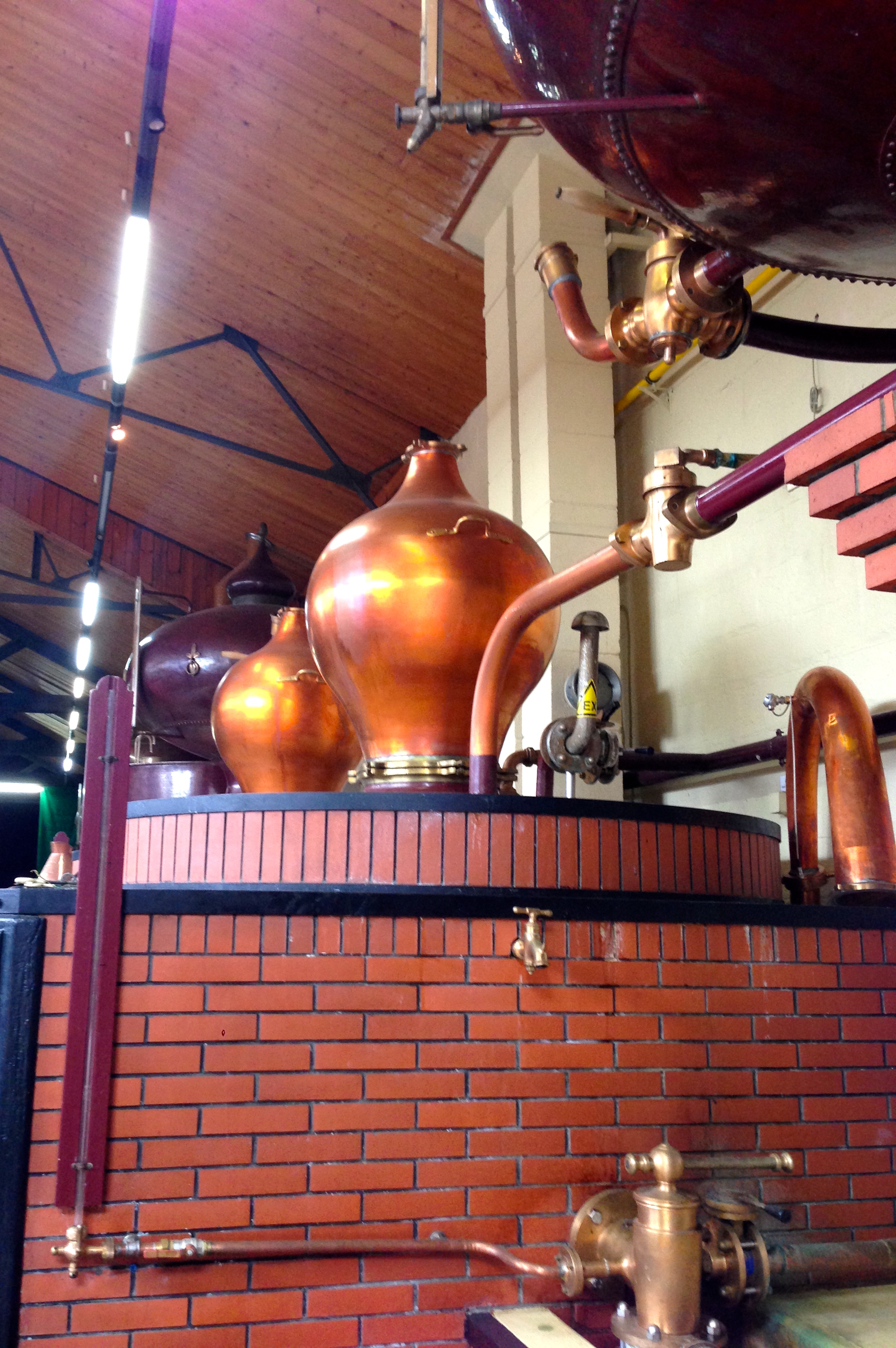 IMG_2823To make the traditional Calvados, the juice is fermented for 6 weeks and tastes like vinegar, as the sugar turns to alcohol.  Next it’s put into vats in the distillery through a piping system. It goes through double distillation, first 8 hours and then 12 hours. There are 2000 liters of “petit l’eau” to start, which ends up as only 300 liters.  The liquid is heated to 30 degrees Celsius, which allows the vapors to be released.  It stays in barrels for a few days to weeks because of the tannins.  Next, it’s transferred to smaller barrels of about 400 liters where it ages for years, depending on the product.  It’s tasted daily at 11am to ensure that it is being properly stored.  The lower end product spends one year in young French oak barrels.  Anything longer would result in a taste that is too oaky.  Our guide at Boulard explained the importance of the barrel, as it denotes the region where the oak comes from and takes on the terroir of the oak, as well as the apples.  Cold water is used to filter the liquid, where it goes from 7% alcohol to 70%, with evaporation that drops to 40%, which is the point at which it can be sold.   Oxidation gives the liquid its characteristic golden color.