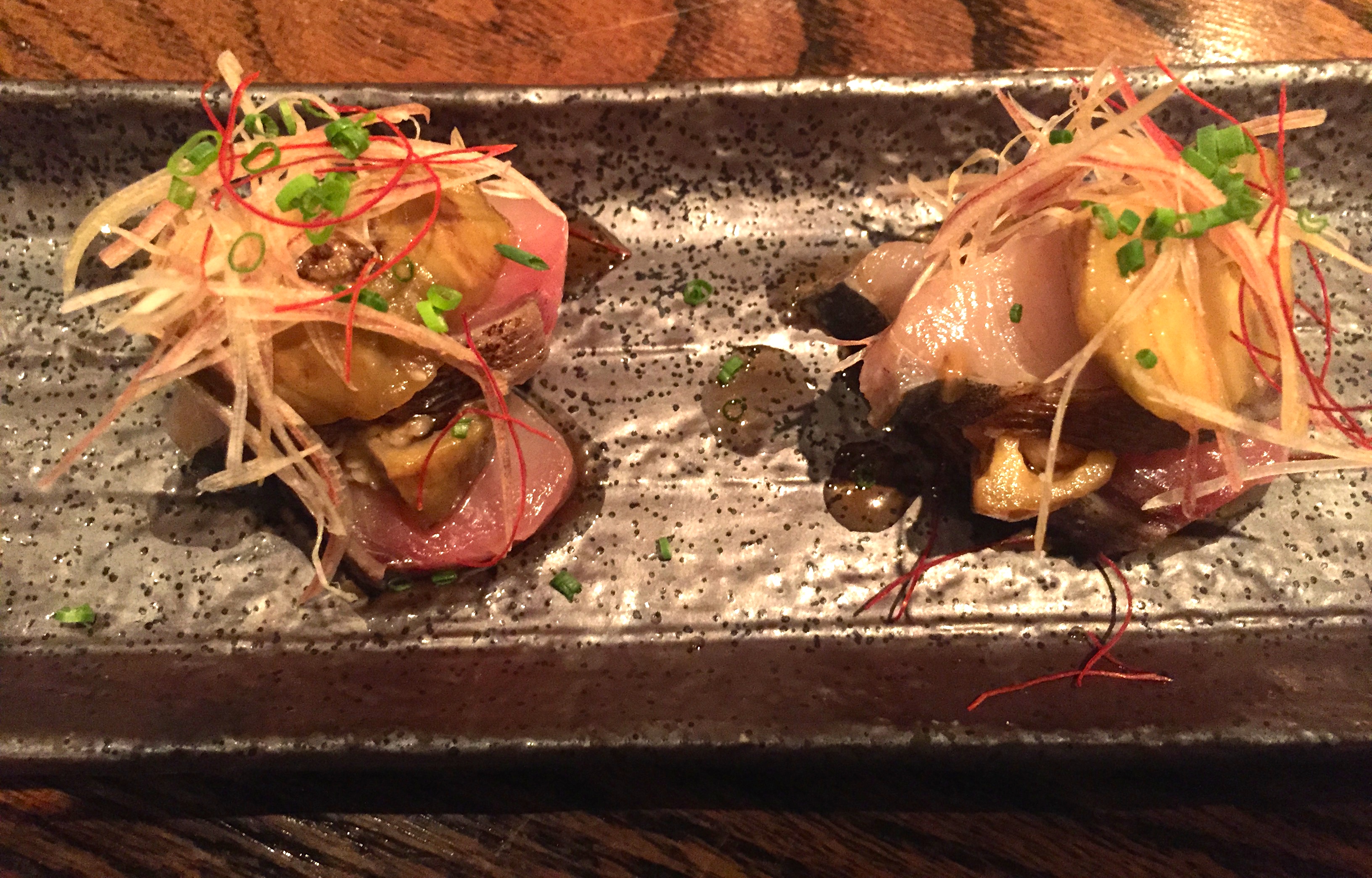 Since we’d been toying with the idea of getting sushi, we should have tried the sashimi tasting ($28 for the small portion on the dinner menu and $48 for the large), but the bartender didn’t seem excited about the fish (not really sure what was going on with her). It looked very good, as I noticed when I walked through the dining room where there was no one even sitting at the sushi bar. Instead, we settled on the Spanish Mackerel Tosazu with nasu (grilled, marinated Japanese eggplant) and slivers of miyoga (Japanese ginger) (also $6 on the bar menu). This was complex and smoky. The flavors worked well together, and it reminded us a little of the hay smoked sashimi we had at Sushi Nakazawa.