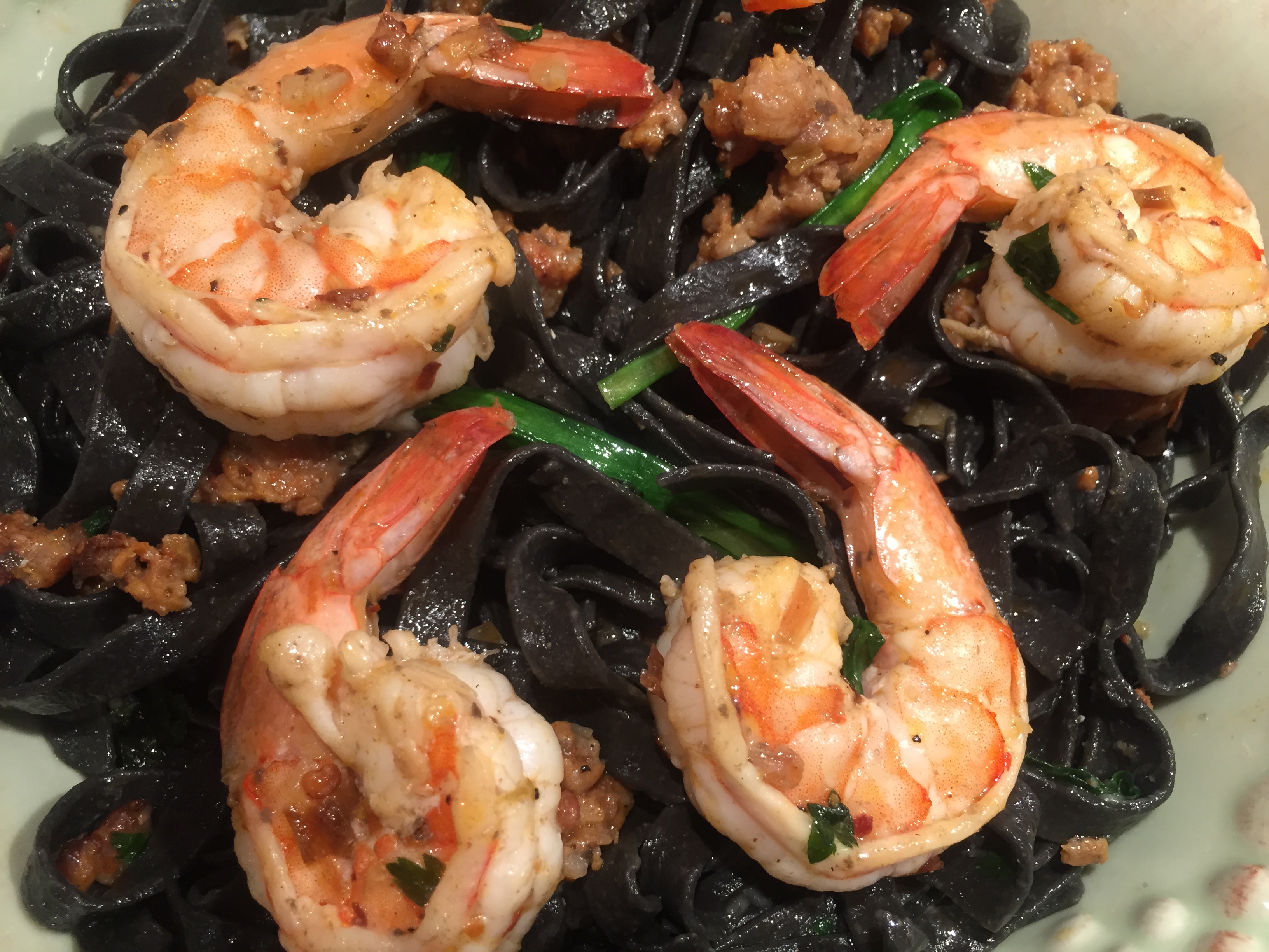 Squid Ink Fettuccine with Sauteed Shrimp, Charred Ramps and Spicy Sausage
