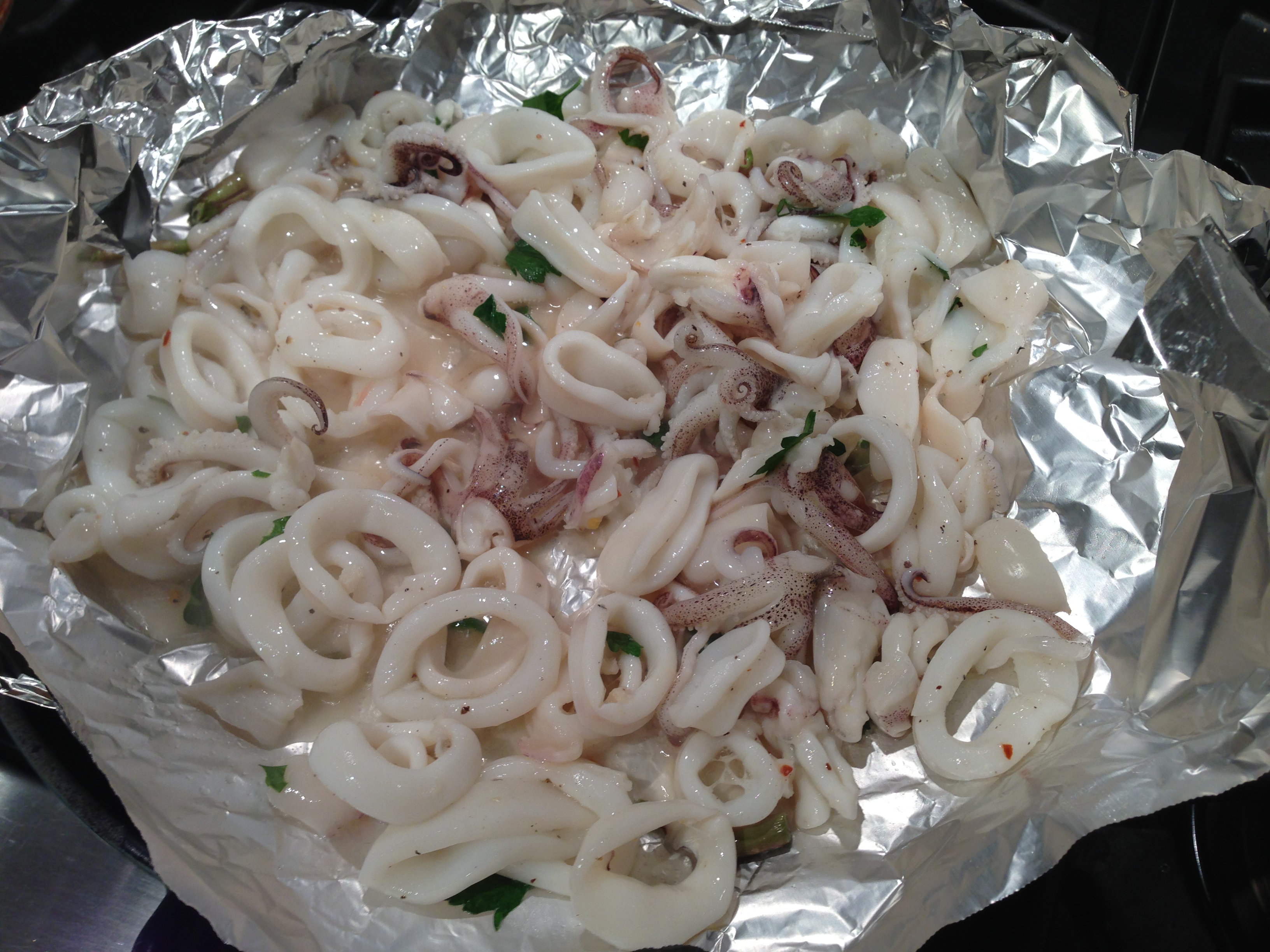 Preheat a grill over medium heat. Dice white parts of ramps. Toss squid with diced ramps, juice from one lemon and a bit of parsley. Add salt, pepper and red pepper to taste. Grill on foil or in a grill basket for 5 minutes.