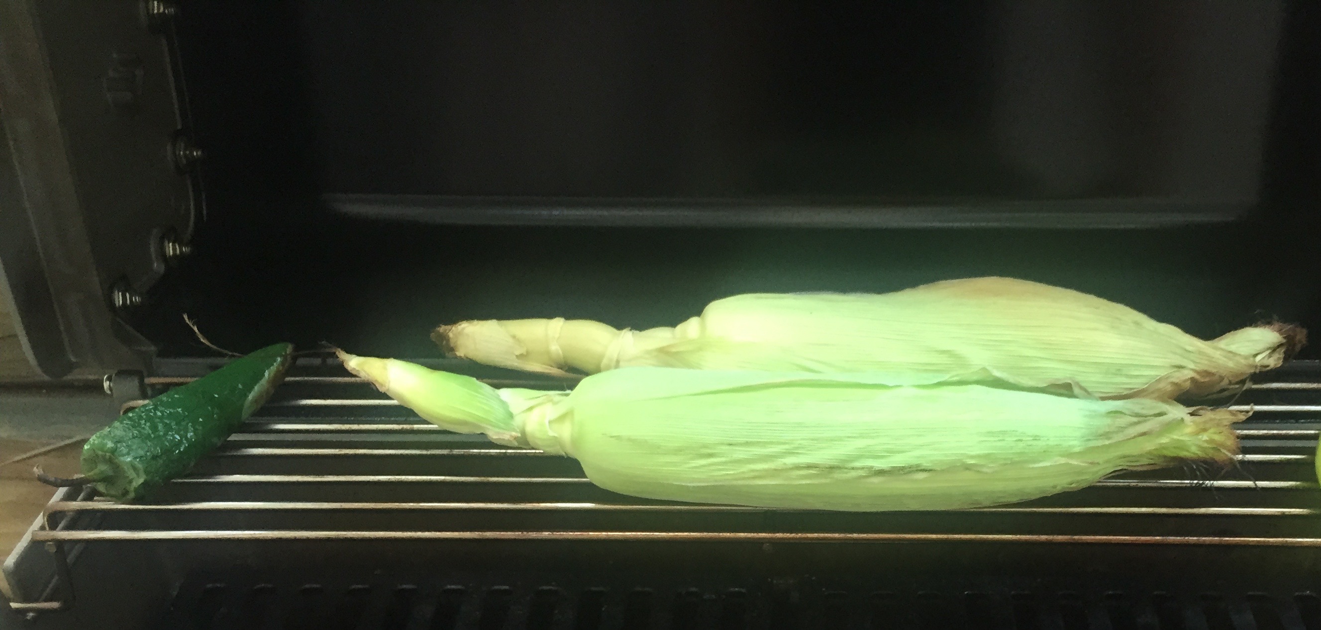 Preheat the grill to medium high. Grill the corn for 5 minutes, turning every couple of minutes. (Tip: you can leave it in the husk if you want, but you’ll get more flavor if you peel the husk and silk away). At the same time, grill the jalapeno, turning until charred on all sides.