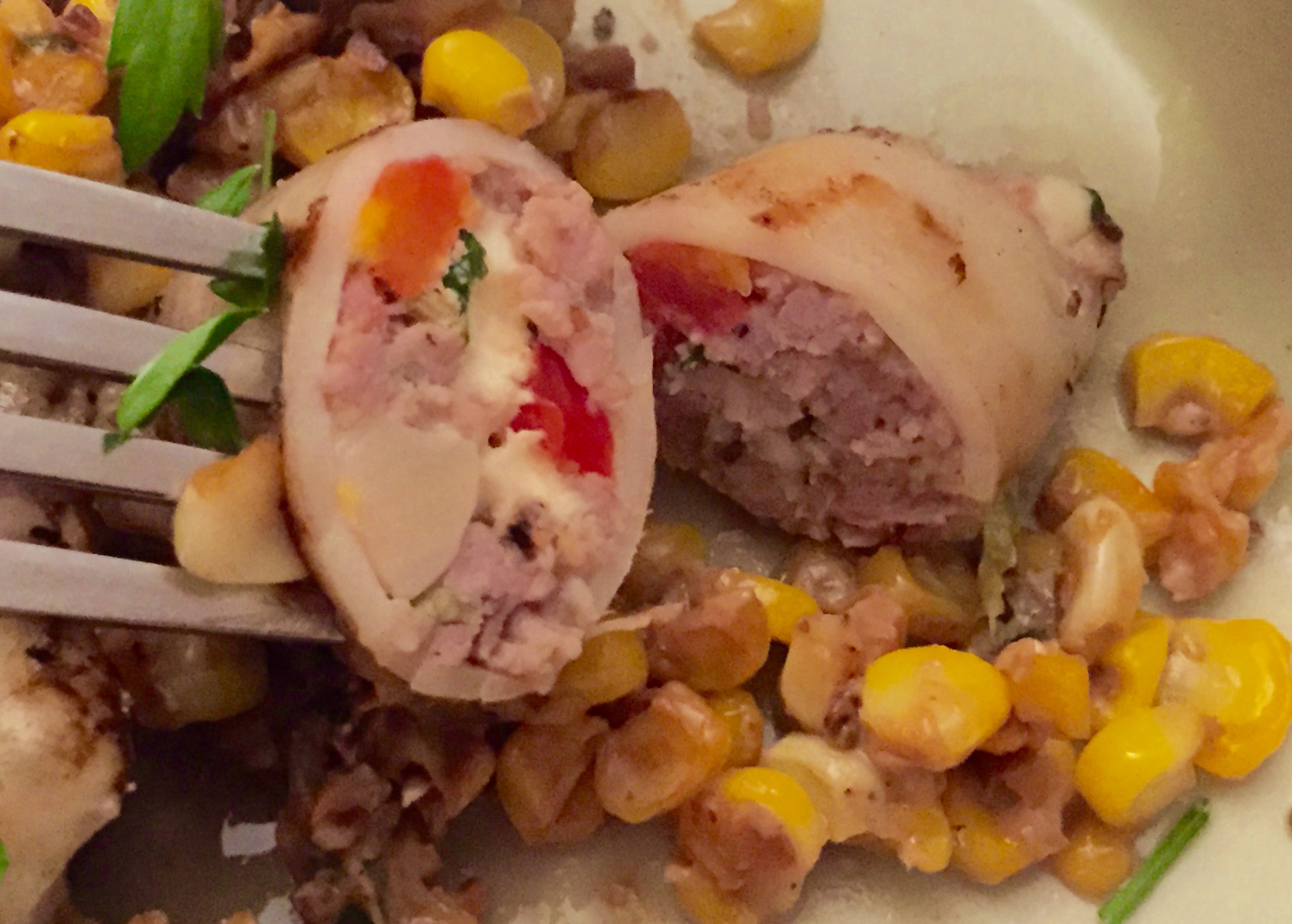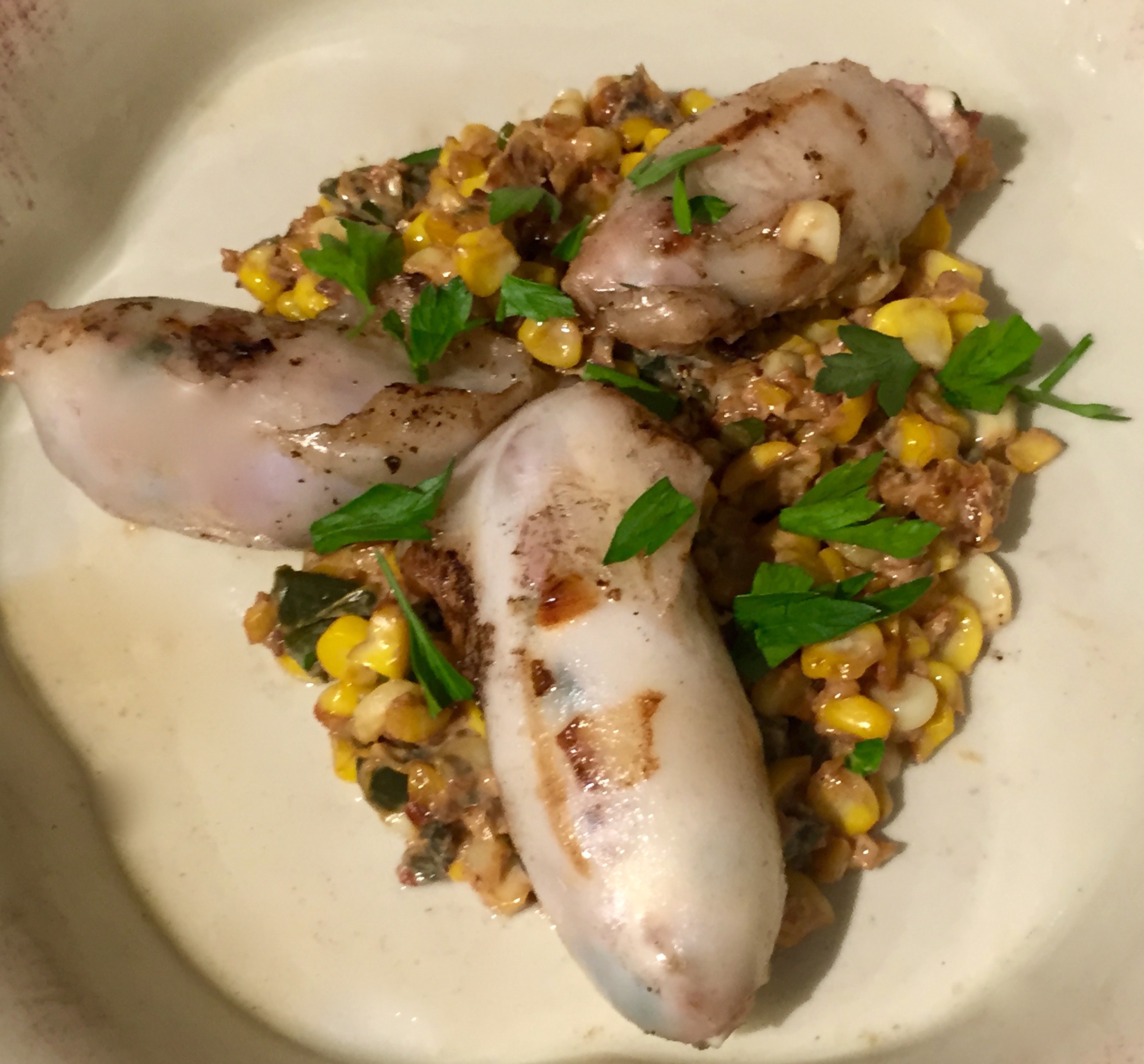 Taste and add more seasoning or cheese if needed. I served this with Chorizo Stuffed Squid. This time I grilled the sausage at the same time as the corn, saving another mess in the kitchen. And since there was plenty of heat in the corn, I went with sweet sausage. Amazing how little changes can have such a huge impact on a dish.